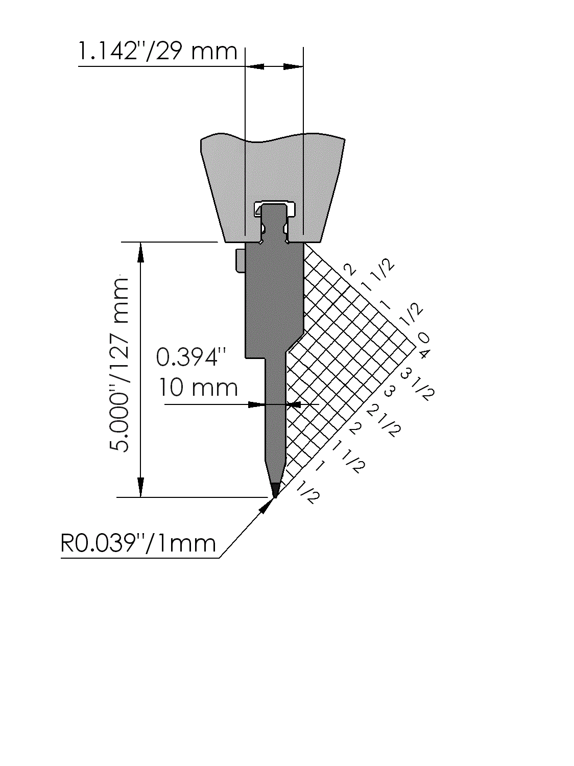 American Style Oberwerkzeug mit Arbeitshöhe=127mm, α=28°, Radius=1mm, geschliffen und CNC-Tiefgehärtet® (mindestens 4mm / 52-60HRc), Material=CR-MO, Max. Belastung=100ton/m. Versehen mit Safety-Clicks™ und deswegen vertikal zu wechseln.
