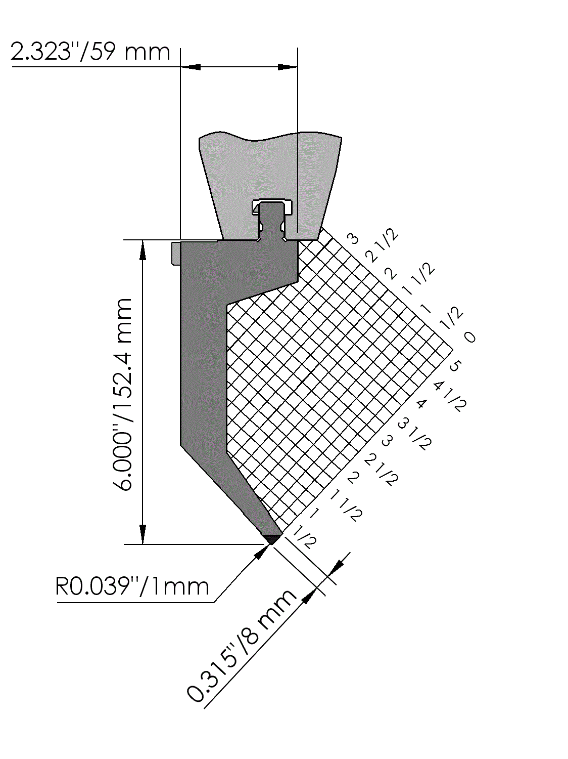 American Style Oberwerkzeug mit Arbeitshöhe=152.4mm, α=86°, Radius=1mm, geschliffen und CNC-Tiefgehärtet® (mindestens 4mm / 52-60HRc), Material=CR-MO, Max. Belastung=65ton/m. Teile <12.5kg versehen mit Safety-Clicks™ und deswegen vertikal zu wechseln; übrige Teile versehen mit Sicherheitsstiften und deswegen nur horizontal zu wechseln.