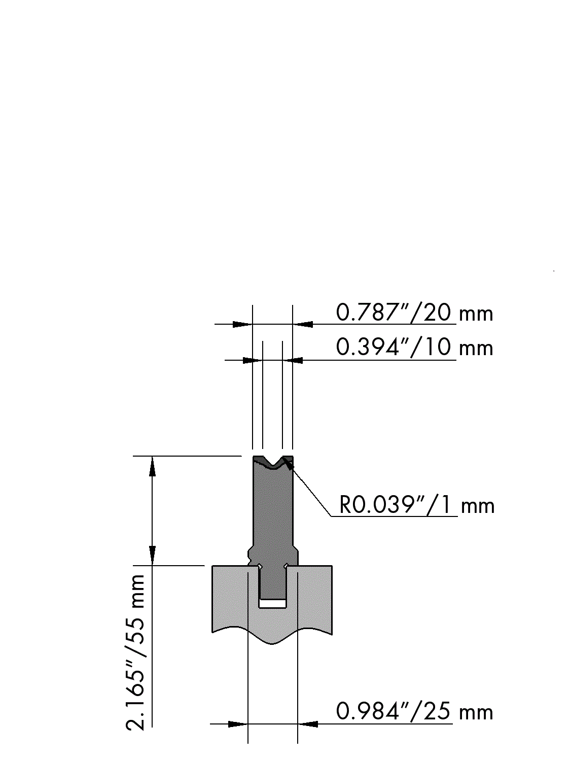 American Style Unterwerkzeug Arbeitshöhe=55mm, V-öffnung=10mm/90°, Biegeradius=1mm, geschliffen und CNC-Tiefgehärtet® (mindestens 4mm / 52-60HRc), Material=CR-MO.