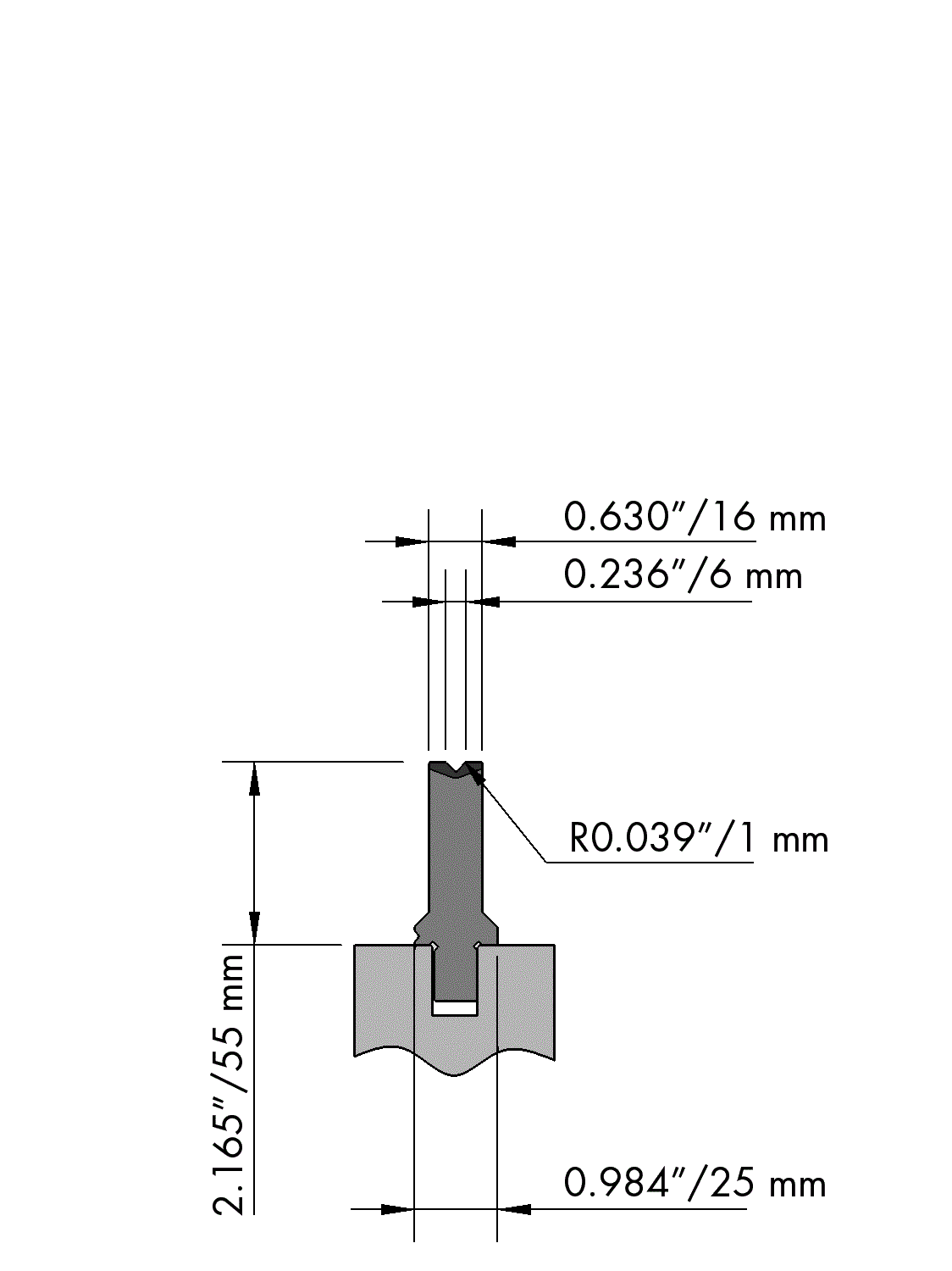American Style Unterwerkzeug Arbeitshöhe=55mm, V-öffnung=6mm/86°, Biegeradius=1mm, geschliffen und CNC-Tiefgehärtet® (mindestens 4mm / 52-60HRc), Material=CR-MO.