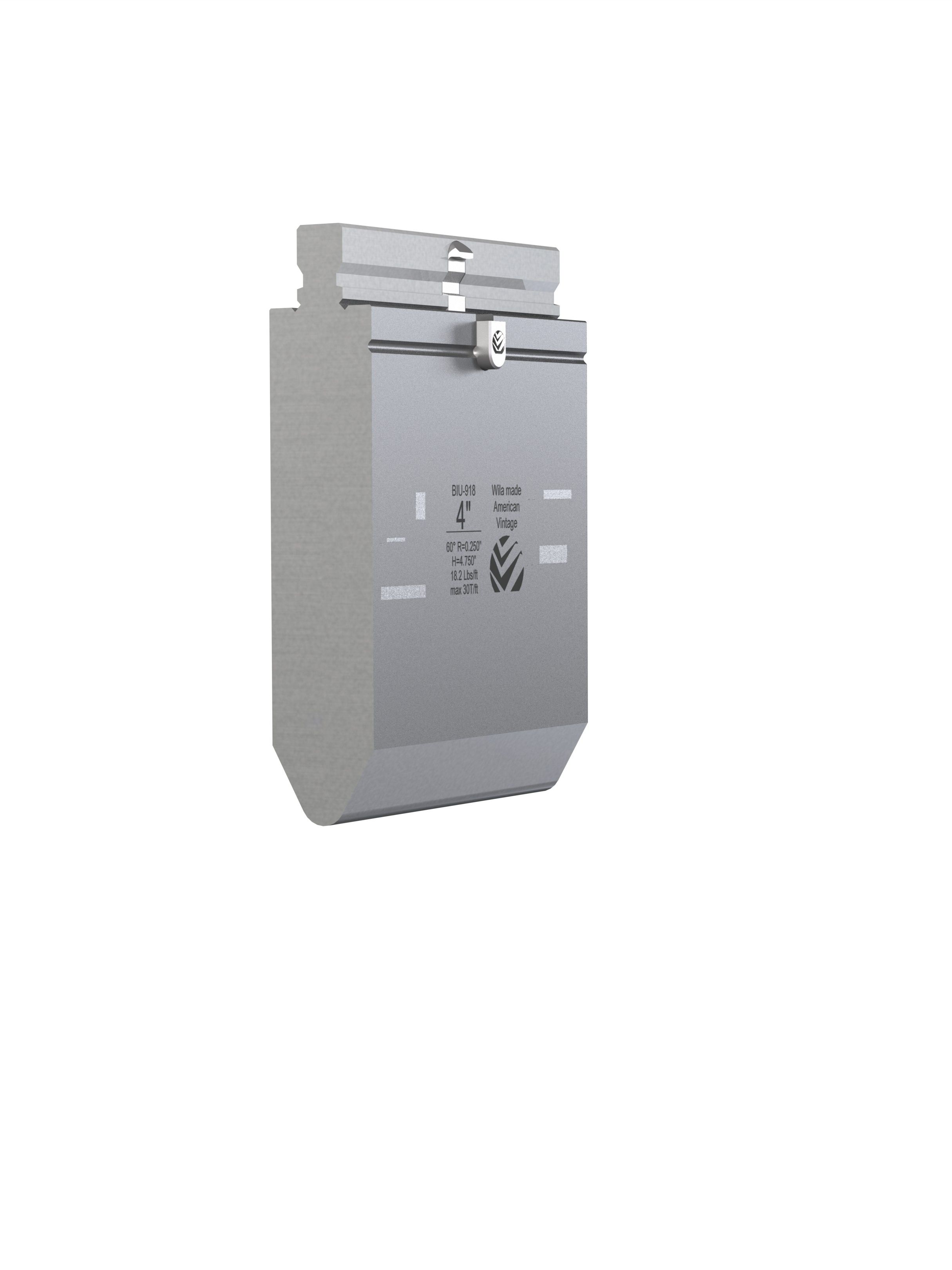 American Vintage Oberwerkzeug mit Arbeitshöhe=120.65mm, α=60°, Radius=6.35mm, geschliffen und CNC-gehärtet (etwa 2mm / mindestens 52HRc), Material=C45, Max. Belastung=100ton/m. Teile <12.5kg versehen mit Safety-Clicks™ und deswegen vertikal zu wechseln; übrige Teile versehen mit Sicherheitsstiften und deswegen nur horizontal zu wechseln.