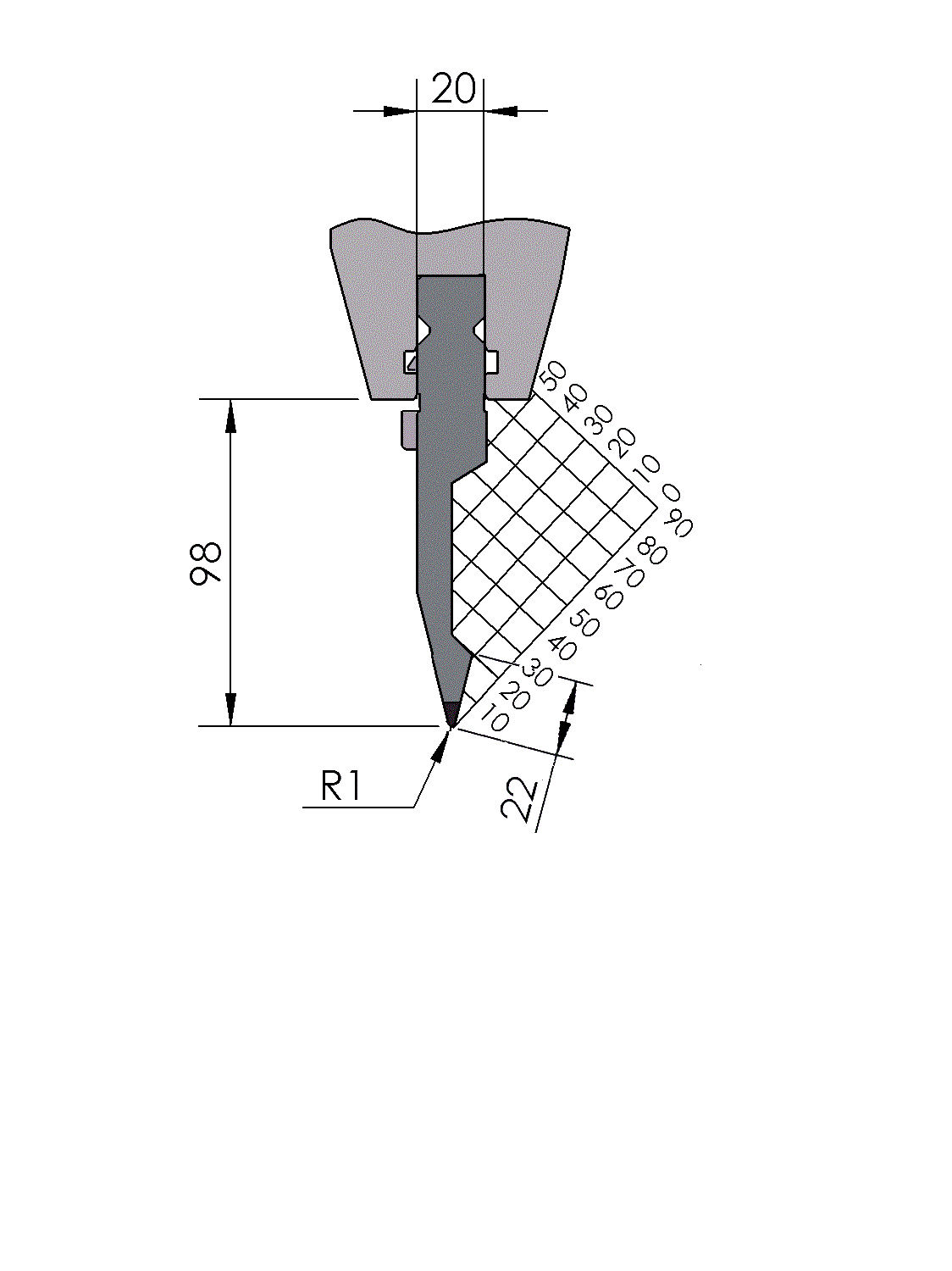 New Standard Premium Oberwerkzeug mit Arbeitshöhe=98mm, α=28°, Radius=1mm, geschliffen und CNC-Tiefgehärtet® (mindestens 4mm / 56-60HRc), Material=CR-MO, Max. Belastung=100ton/m. Versehen mit Safety-Clicks™ und deswegen vertikal zu wechseln.