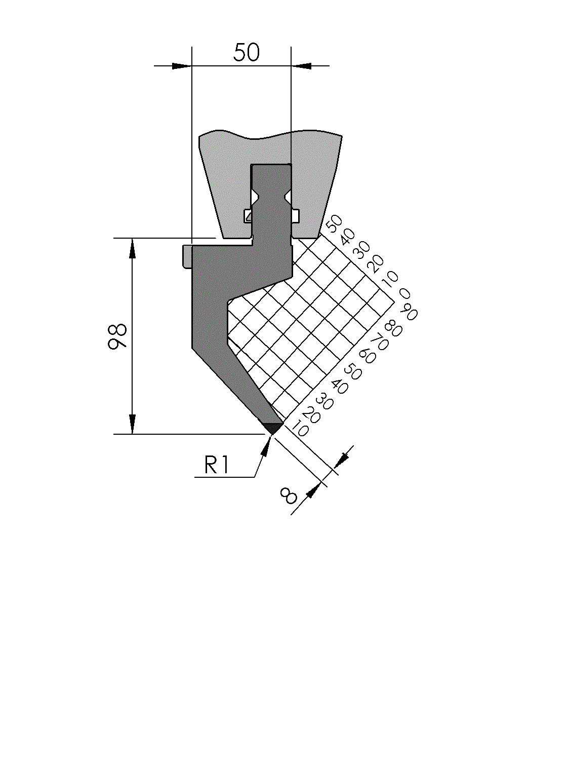 New Standard Premium Oberwerkzeug mit Arbeitshöhe=98mm, α=86°, Radius=1mm, geschliffen und CNC-Tiefgehärtet® (mindestens 4mm / 56-60HRc), Material=CR-MO, Max. Belastung=65ton/m. Versehen mit Safety-Clicks™ und deswegen vertikal zu wechseln.