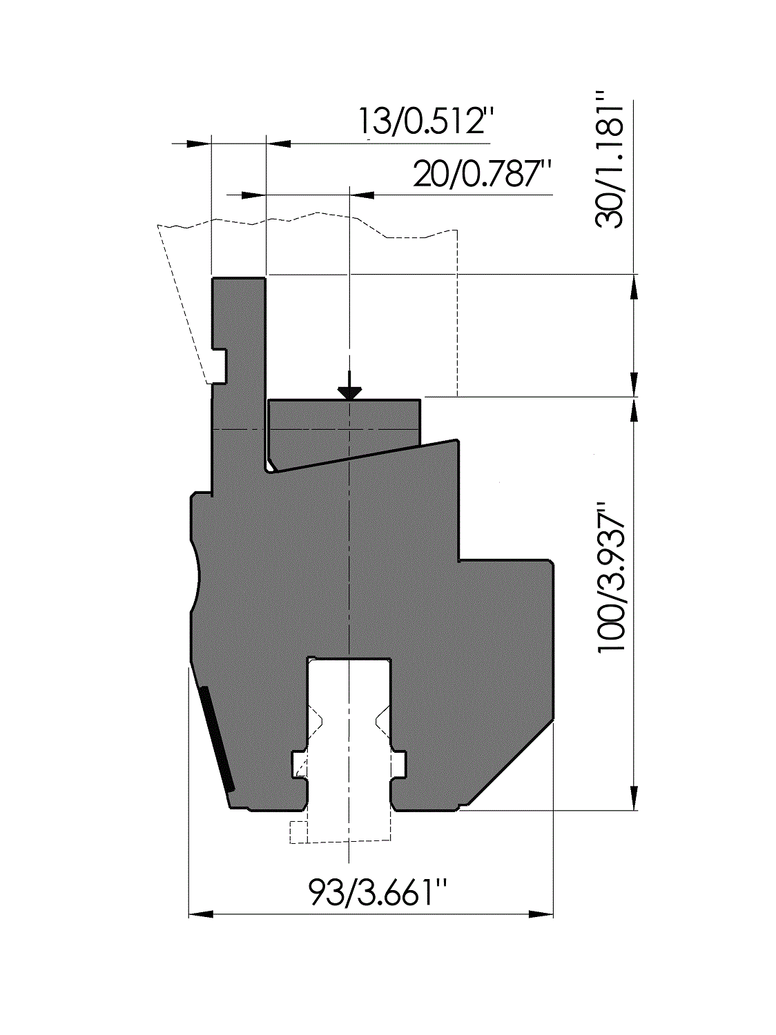 Arbeitshöhe=100mm, Breite=93mm, versehen mit Amada Oberwerkzeugaufnahme (Abstand Mittellinie bis zum Zapfen 20mm) und Bombierkeil (Ty-Ausrichtung), manuelle Bedienung mittels Zug- und Druckschrauben, hydraulischer Klemmung (max. 50bar), Öleintritt ø10mm, links-Stirnseite, Material=C45 nicht gehärtet, Gewicht=48kg/m, Max. Belastung=250ton/m.