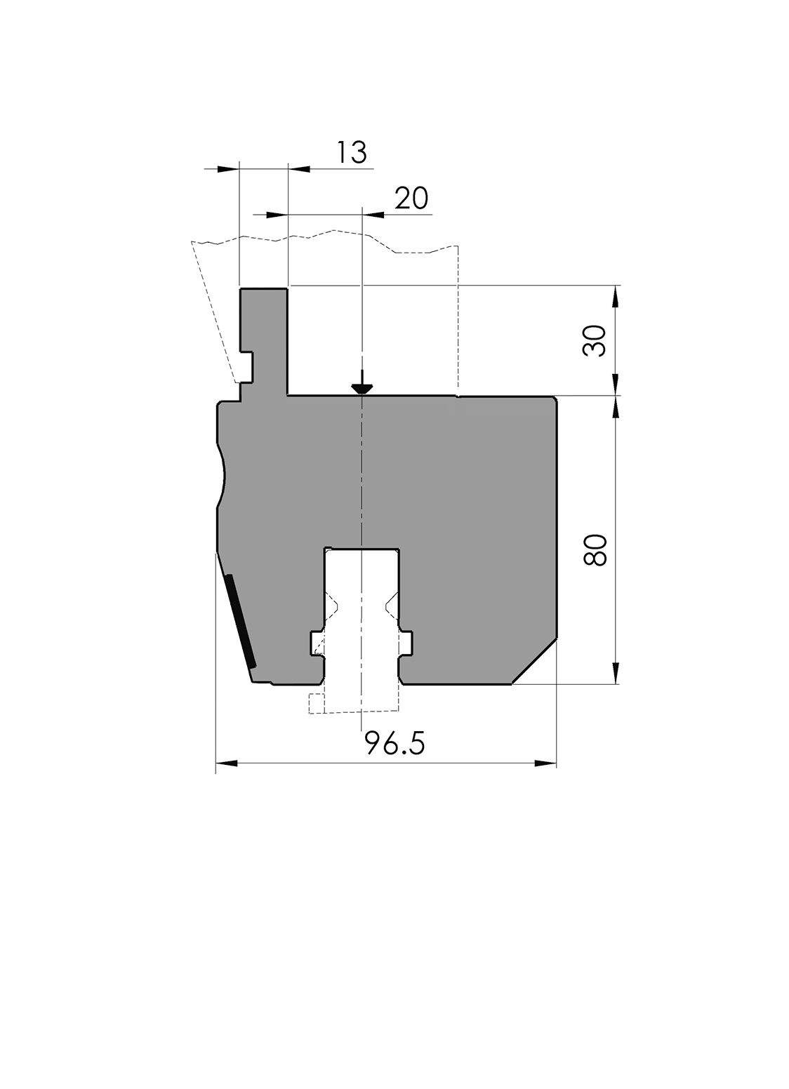 Arbeitshöhe=80mm, Breite=92mm, versehen mit Amada Oberwerkzeugaufnahme (Abstand Mittellinie bis zum Zapfen 20mm), pneumatischer Klemmung, links und rechts-hinten, Material=C45 nicht gehärtet, Max. Belastung=180ton/m.
