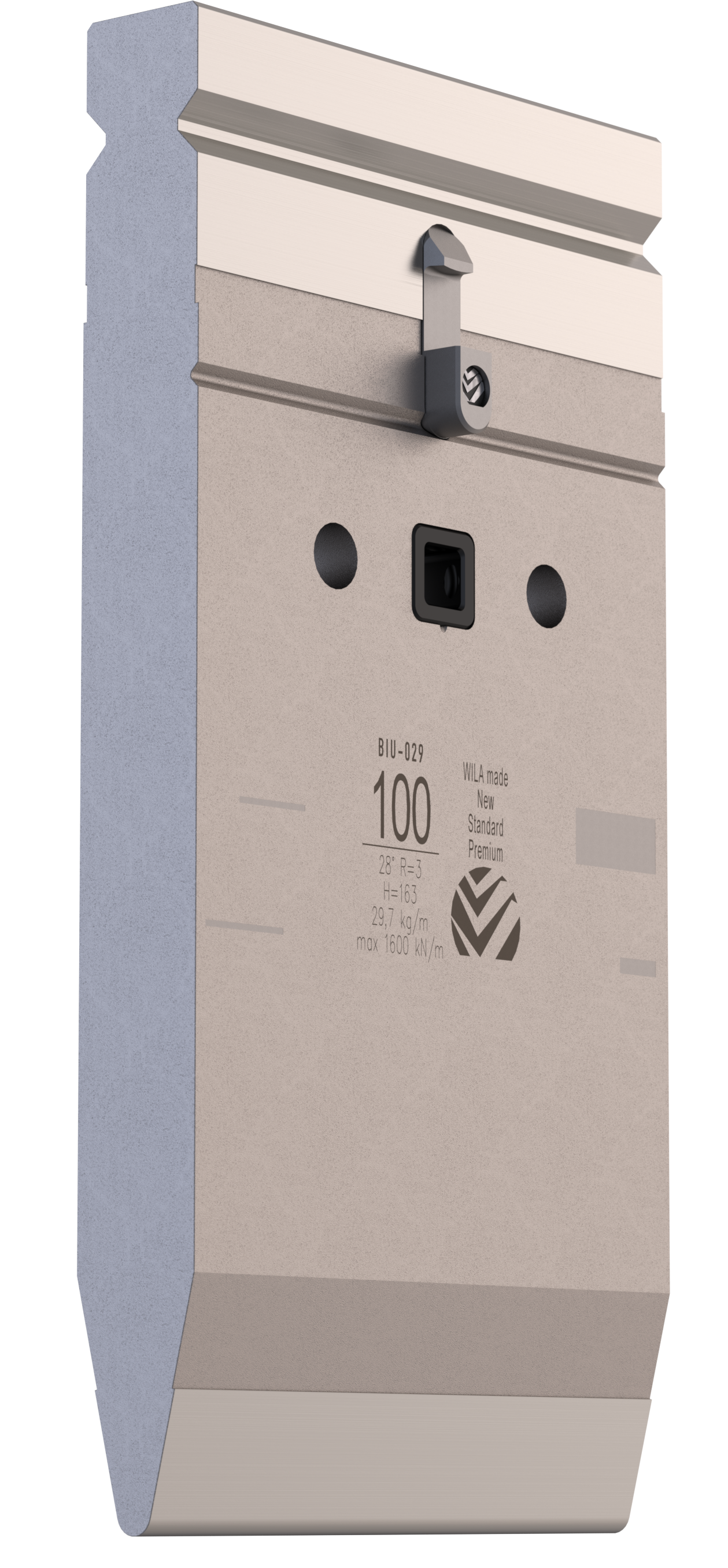 New Standard Premium Oberwerkzeug versehen mit ATC-adapter, mit Arbeitshöhe=163mm, α=28°, Radius=3mm CNC-Tiefgehärtet® (mindestens 4mm / 56-60HRc), Material=CR-MO, Max. Belastung=160ton/m. Teile <12.5kg versehen mit Safety-Clicks™ und deswegen vertikal zu wechseln; übrige Teile versehen mit Sicherheitsstiften und deswegen nur horizontal zu wechseln.
