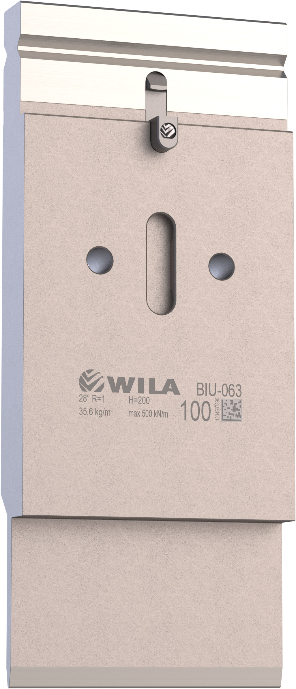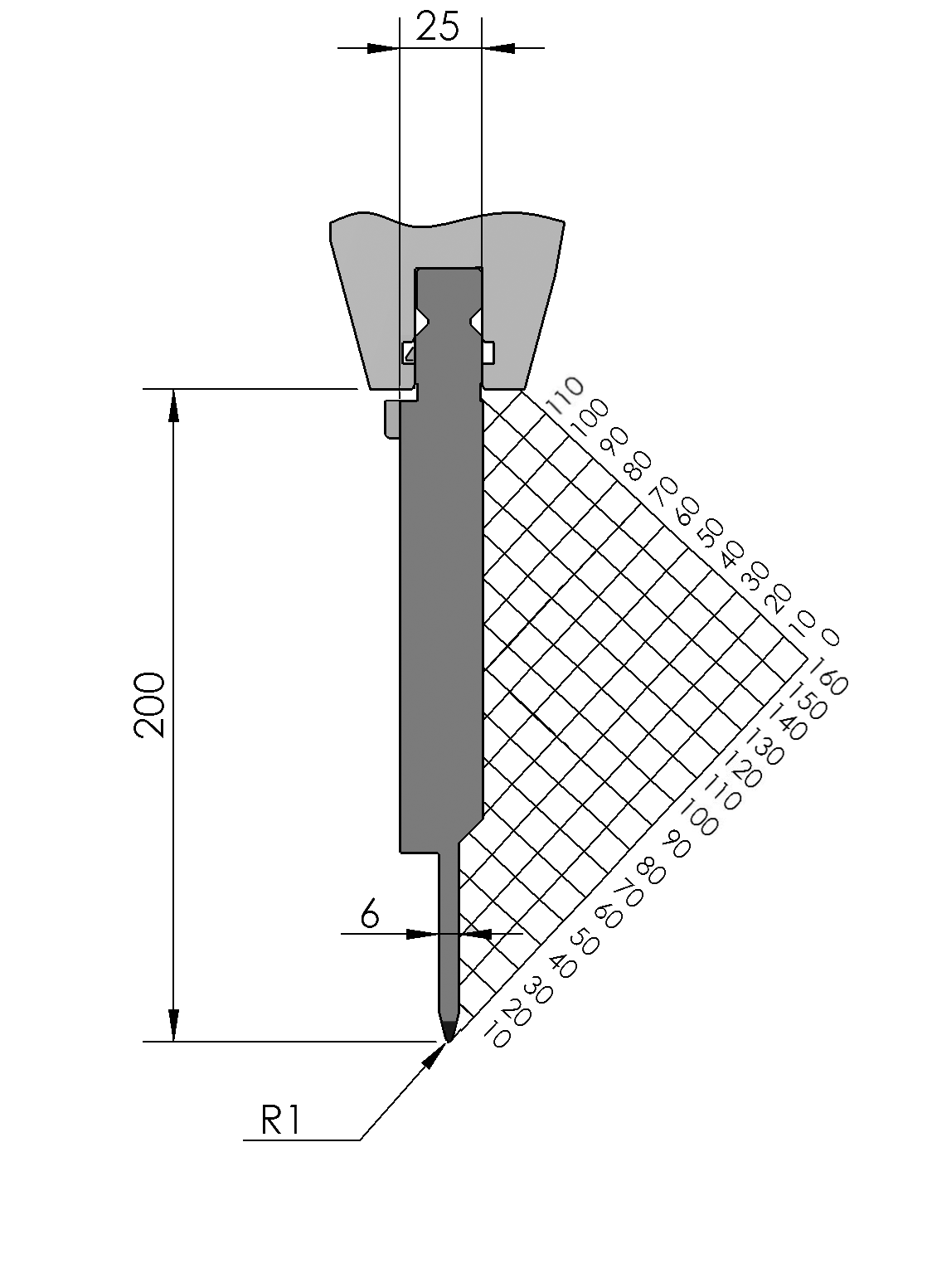 New Standard Premium Oberwerkzeug versehen mit WILA New Standard ATC, mit Arbeitshöhe=200mm, α=28°, Radius=1mm mit Zudrückfläche CNC-Tiefgehärtet® (mindestens 4mm / 56-60HRc), Material=CR-MO, Max. Belastung=50ton/m. Versehen mit Safety-Clicks™ und deswegen vertikal zu wechseln.