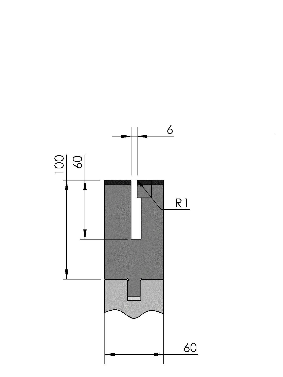 New Standard Premium Unterwerkzeug versehen mit WILA New Standard ATC, Arbeitshöhe=100mm, U-öffnung=6x60mm (BxD), Biegeradius=1mm CNC-Tiefgehärtet® (mindestens 4mm / 56-60HRc), Material=CR-MO