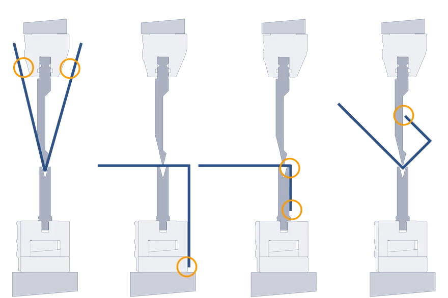 Bei mehreren Biegungen in der gleichen Ebene besteht die Gefahr, dass das Blech mit der Abkantpresse, dem Werkzeughalter oder dem Stempel in Berührung kommt. Die Form des Stempels kann dann der begrenzende Faktor sein. Wenn eine der Biegungen in die entgegengesetzte Richtung geht, kann die Matrize selbst im Weg sein.