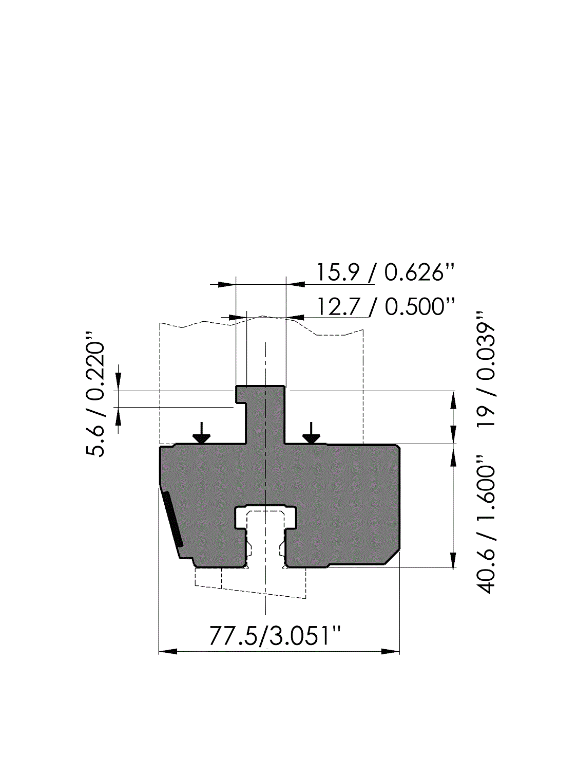 Working height=40.6mm, Width=77.5mm, provided with American Style adaptation, hydraulic clamping (max. 50bar), oil supply ø10mm, left end, Material=C45 not hardened, Weight=1850kg/m, Max. load=230ton/m.