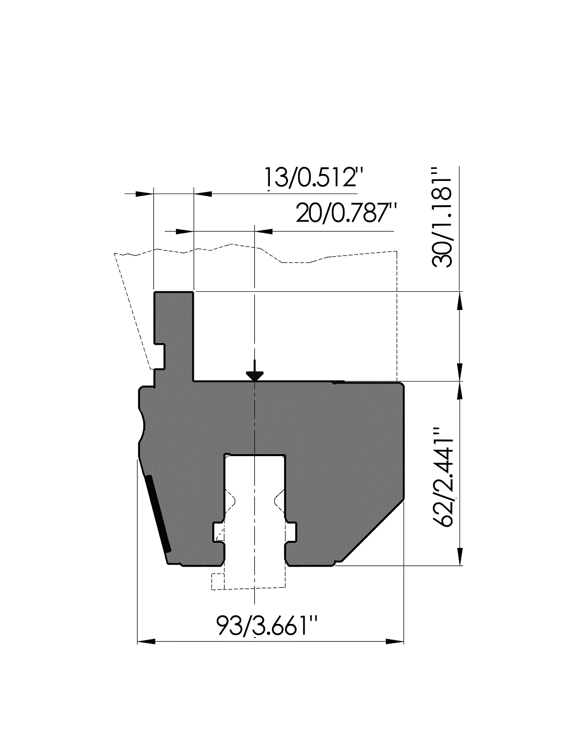 Working height=62mm, Width=93mm, provided with Amada adaptation (center line at 20mm) , hydraulic clamping (max. 50bar), oil supply ø10mm, left end, Material=C45 not hardened.