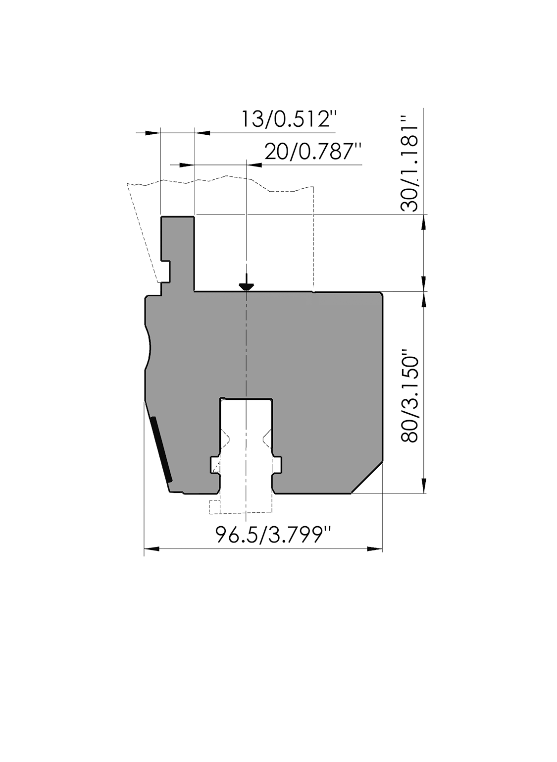 Working height=80mm, Width=92mm, provided with Amada adaptation (center line at 20mm) , pneumatic clamping, left and right rear, Material=C45 not hardened, Max. load=180ton/m.
