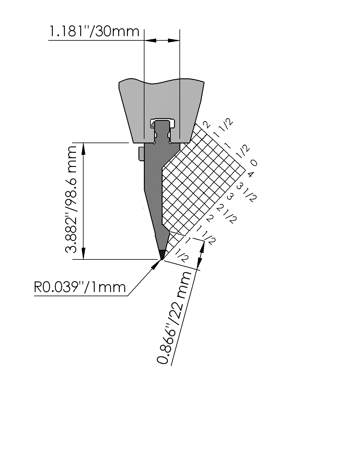 American Style top tool with Working height H=98.6mm, α=28°, Radius=1mm, precision ground and CNC-Deephardened® (at least 4mm / 52-60HRc), Material=CR-MO, Max. load=100ton/m. Provided with Safety-Clicks™, which allows you to change the tooling vertically.