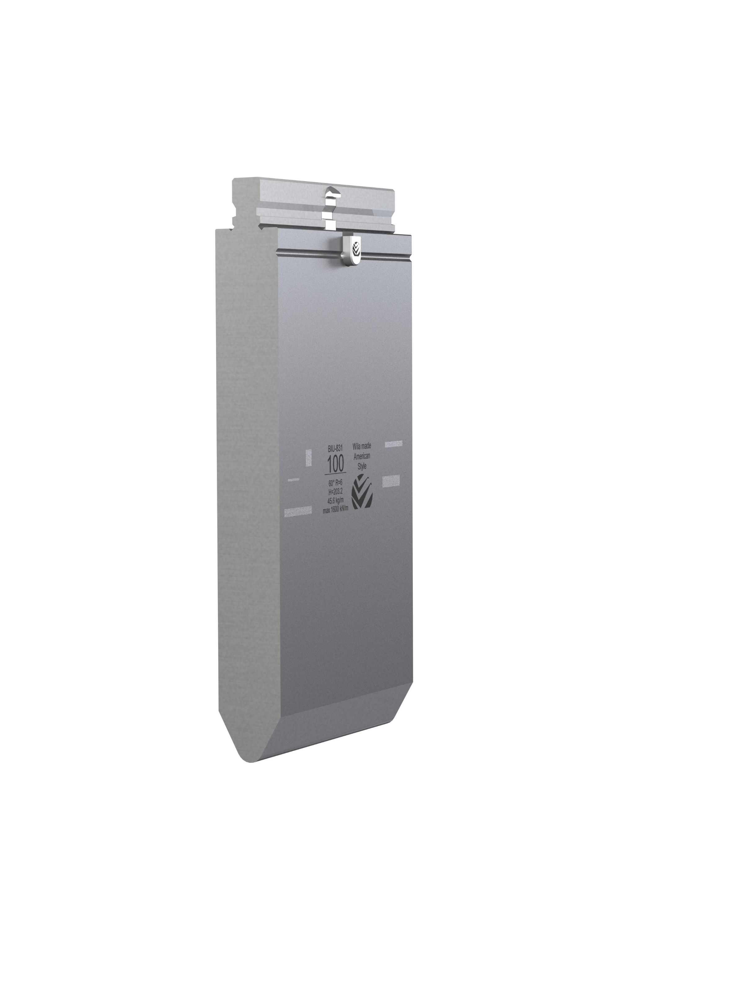 American Style top tool with Working height H=152.4mm, α=60°, Radius=6mm, precision ground and CNC-Deephardened® (at least 4mm / 52-60HRc), Material=CR-MO, Max. load=160ton/m. Parts <12.5kg provided with Safety-Clicks™, which allows you to change the tooling vertically; all other parts provided with fixed safety pins, which only allows you to change the tooling horizontally.
