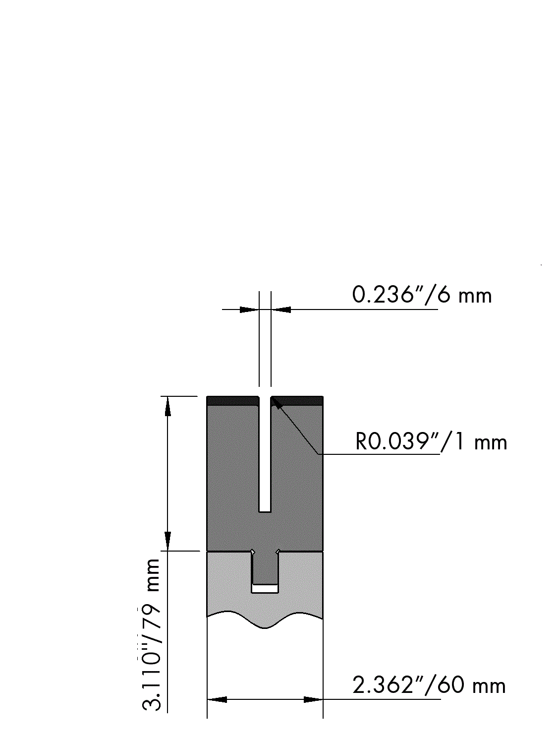 American Style bottom tool Working height=79mm, U-opening=6x59mm (BxD), Bending radius=1mm, precision ground and CNC-Deephardened® (at least 4mm / 52-60HRc), Material=CR-MO.