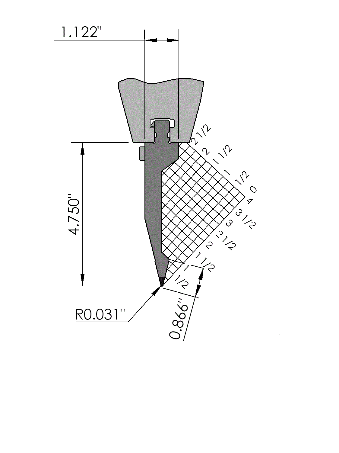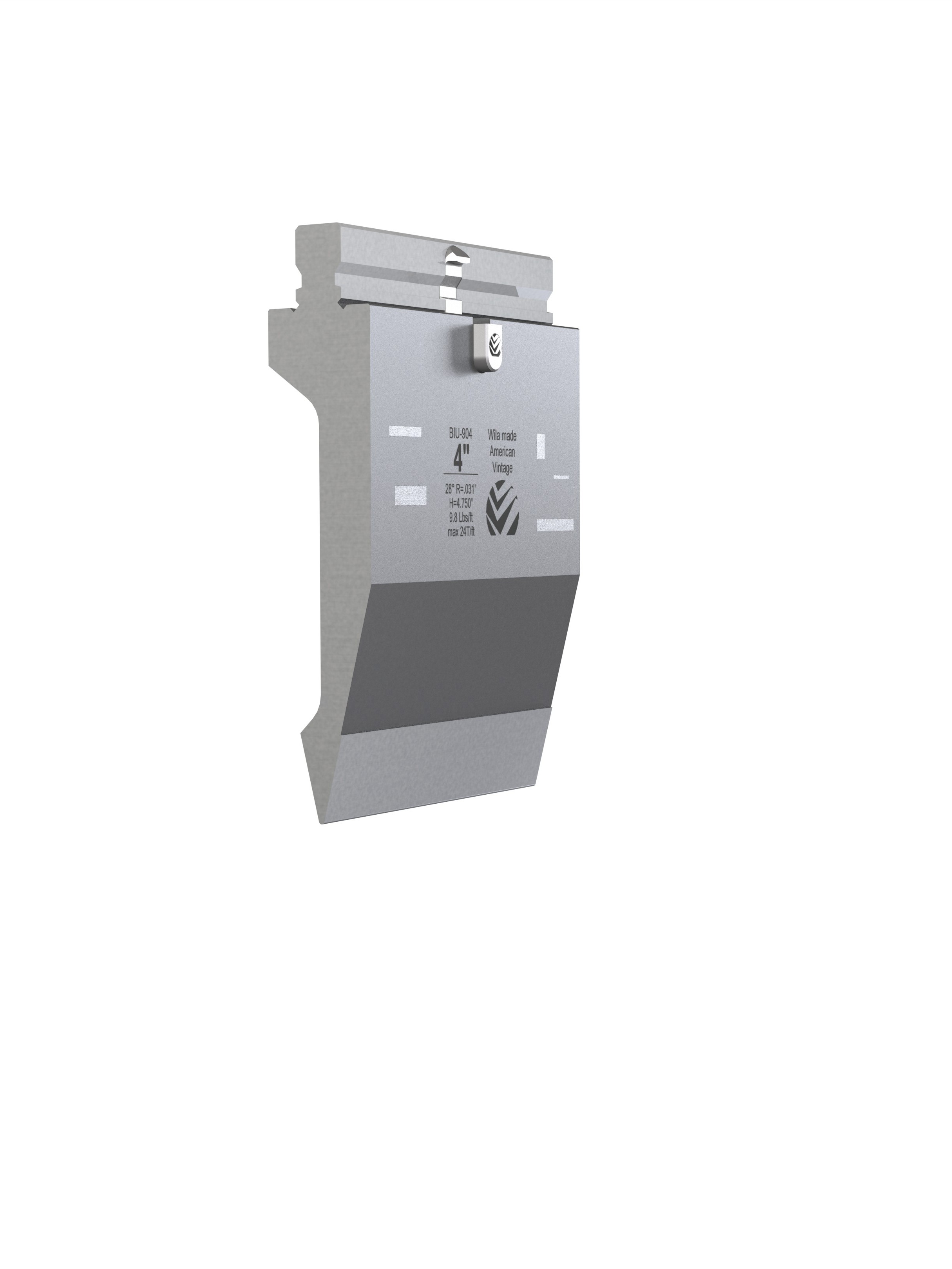 American Vintage top tool with Working height H=4.750", α=28°, Radius=.031", precision ground and CNC-hardened (approx. 0.079" / at least 52HRc), Material=C45, Max. load=24 Tons/ft. Provided with Safety-Clicks™, which allows you to change the tooling vertically.