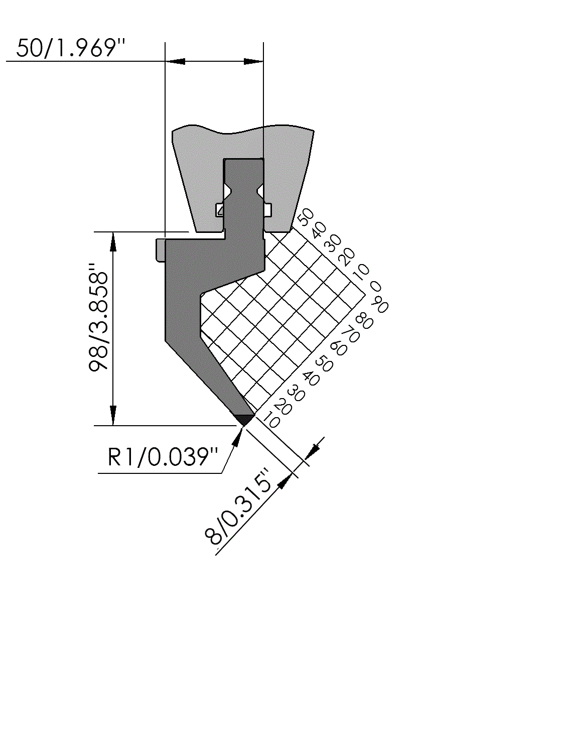 New Standard Premium top tool with Working height H=98mm, α=86°, Radius=1mm, precision ground and CNC-Deephardened® (at least 4mm / 56-60HRc), Material=CR-MO, Max. load=65ton/m. Provided with Safety-Clicks™, which allows you to change the tooling vertically.