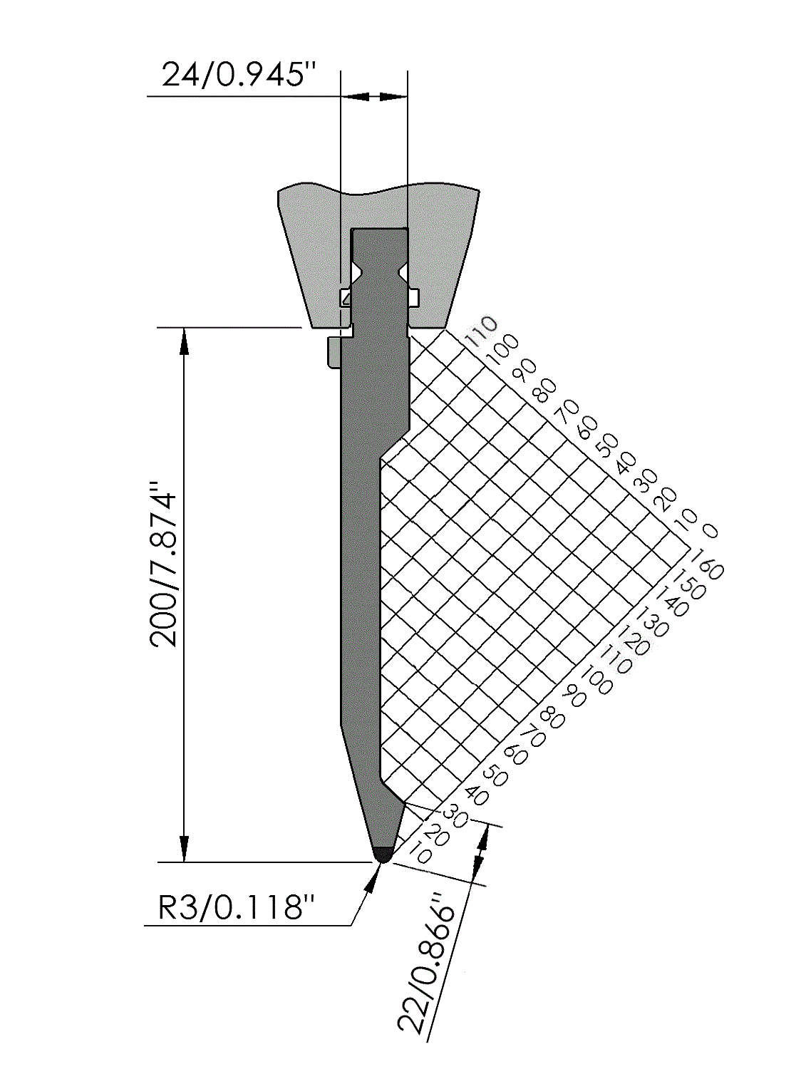 New Standard Premium top tool with Working height H=200mm, α=28°, Radius=3mm, precision ground and CNC-Deephardened® (at least 4mm / 56-60HRc), Material=CR-MO, Max. load=100ton/m. Parts <12.5kg provided with Safety-Clicks™, which allows you to change the tooling vertically; all other parts provided with fixed safety pins, which only allows you to change the tooling horizontally.