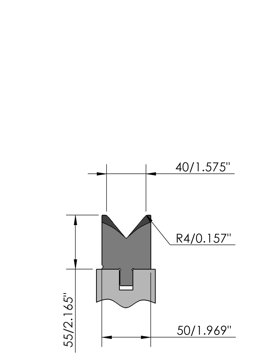 New Standard Premium bottom tool Working height=55mm, V-opening=40mm/80°, Bending radius=4mm, precision ground and CNC-Deephardened® (at least 4mm / 56-60HRc), Material=CR-MO