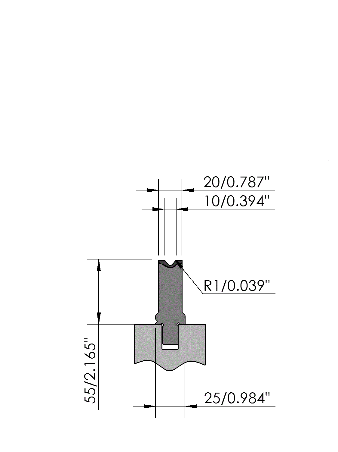 New Standard Premium bottom tool Working height=55mm, V-opening=10mm/86°, Bending radius=1mm, precision ground and CNC-Deephardened® (at least 4mm / 56-60HRc), Material=CR-MO