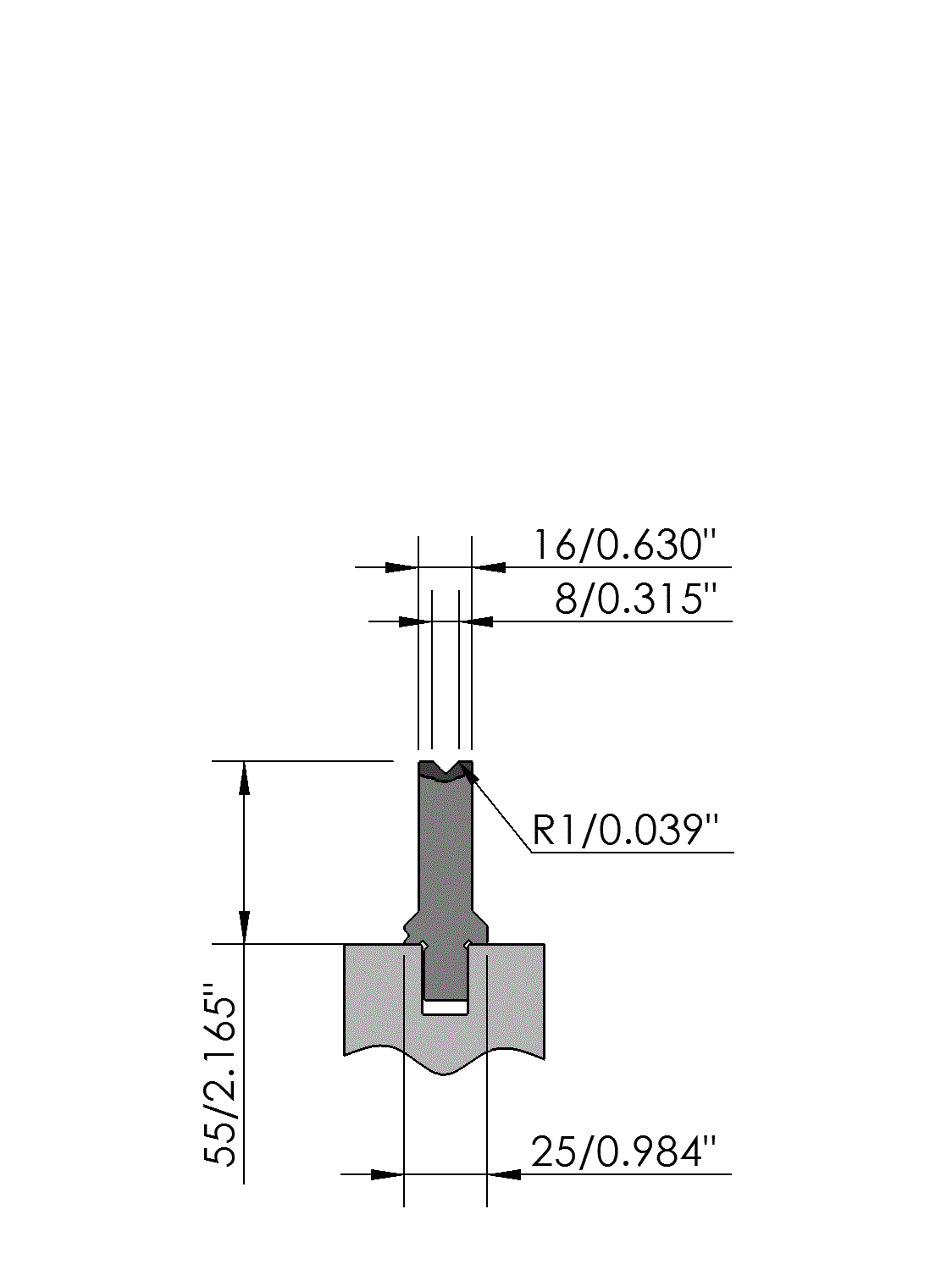 New Standard Premium bottom tool Working height=55mm, V-opening=8mm/90°, Bending radius=1mm, precision ground and CNC-Deephardened® (at least 4mm / 56-60HRc), Material=CR-MO