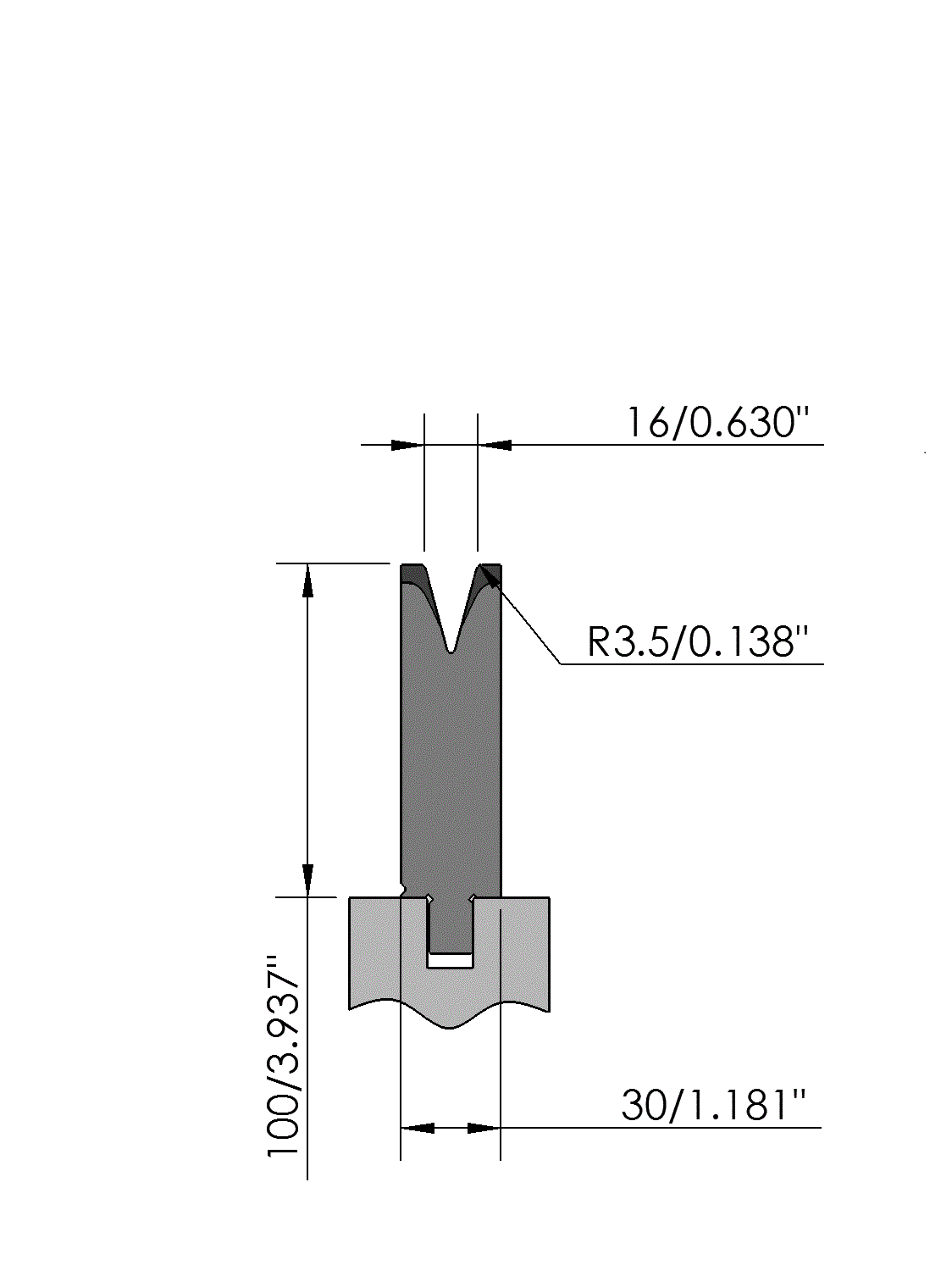 New Standard Premium bottom tool Working height=100mm, V-opening=16mm/30°, Bending radius=3.5mm, precision ground and CNC-Deephardened® (at least 4mm / 56-60HRc), Material=CR-MO