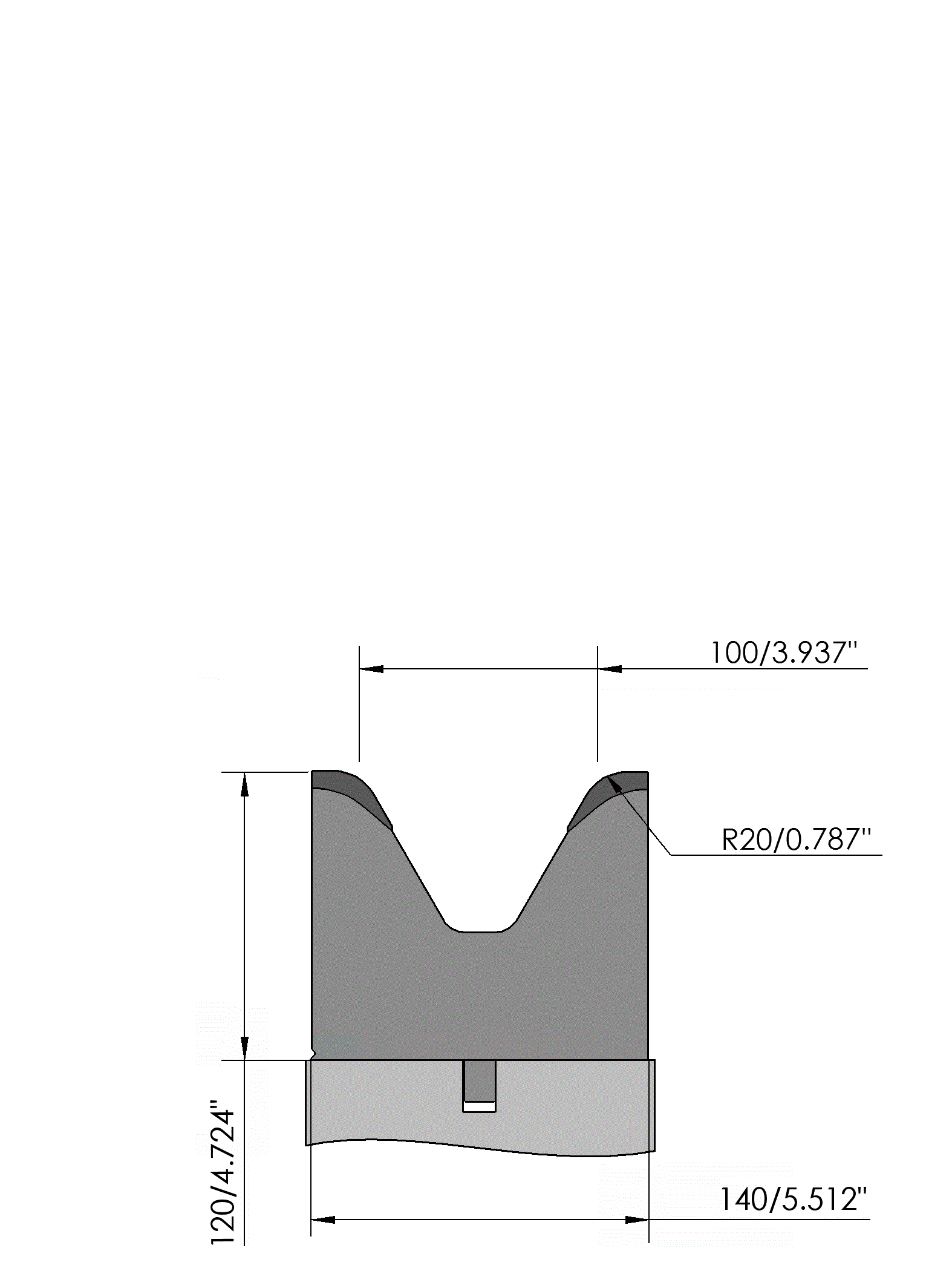 New Standard Premium bottom tool Working height=120mm, V-opening=100mm/60°, Bending radius=20mm, precision ground and CNC-Deephardened® (at least 4mm / 56-60HRc), Material=CR-MO
