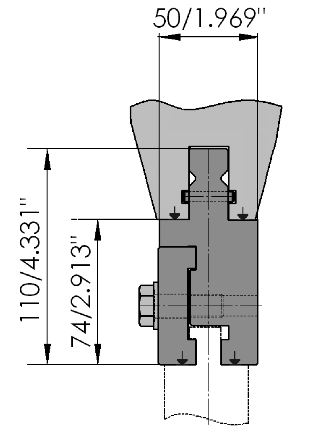 Working height=74mm, Width=50mm, Material=CR-MO, not hardened, weight: 16.9kg/m, Max. load=250ton/m.