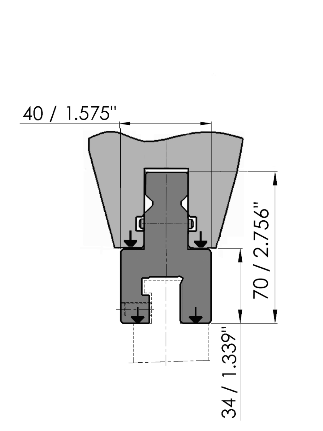 Working height=34mm, Width=40mm, Material=C45, not hardened, weight: 13.5kg/m, Max. load=160ton/m.