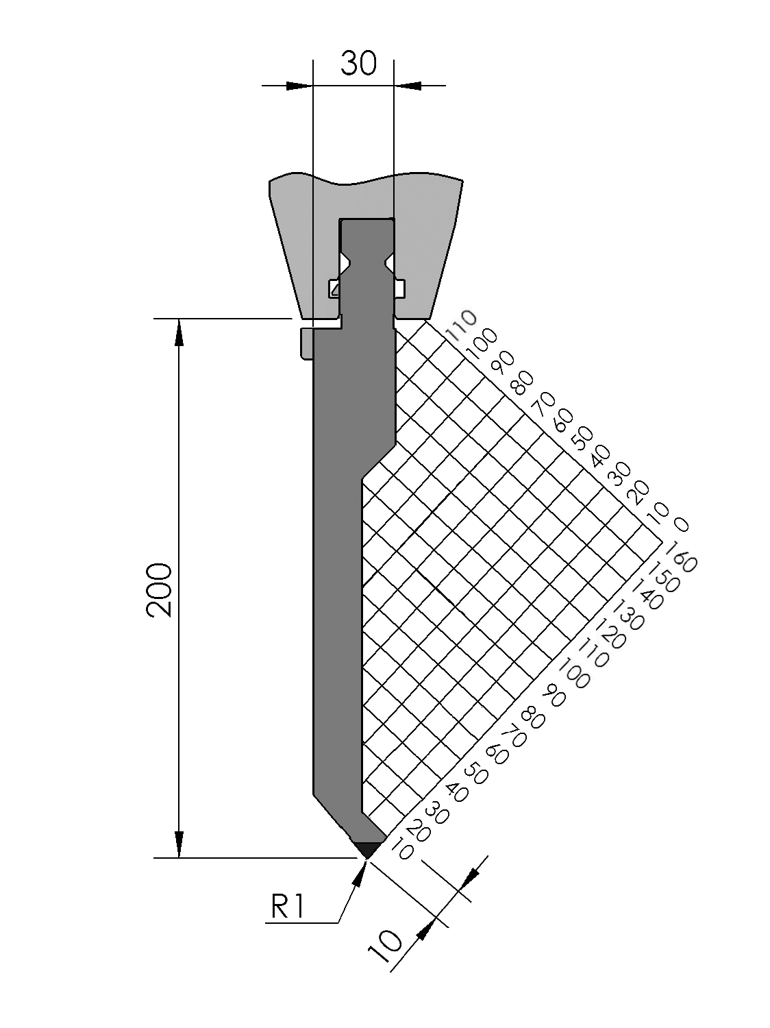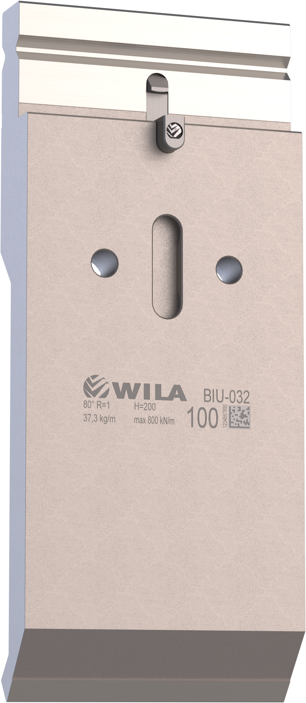 New Standard Premium top tool provided with WILA New Standard ATC, with Working height H=200mm, α=80°, Radius=1mm CNC-Deephardened® (at least 4mm / 56-60HRc), Material=CR-MO, Max. load=80ton/m. Provided with Safety-Clicks™, which allows you to change the tooling vertically.