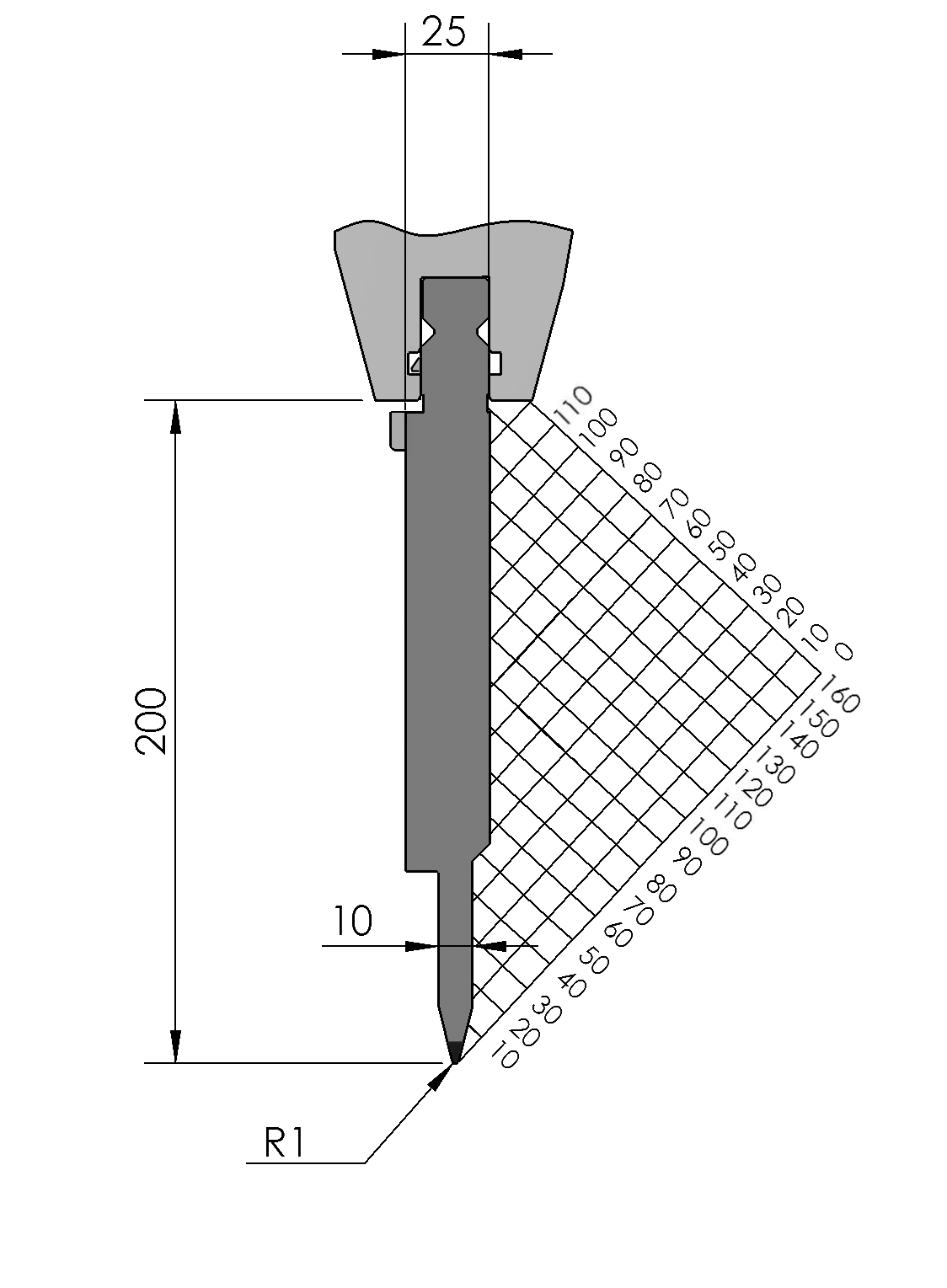 New Standard Premium top tool provided with WILA New Standard ATC, with Working height H=200mm, α=28°, Radius=1mm including flattening surface CNC-Deephardened® (at least 4mm / 56-60HRc), Material=CR-MO, Max. load=100ton/m. Provided with Safety-Clicks™, which allows you to change the tooling vertically.