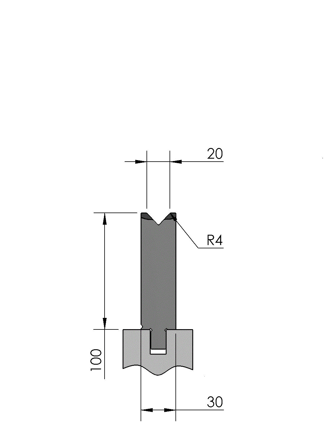 New Standard Premium bottom tool provided with WILA New Standard ATC, Working height=100mm, V-opening=20mm/86°, Bending radius=4mm CNC-Deephardened® (at least 4mm / 56-60HRc), Material=CR-MO
