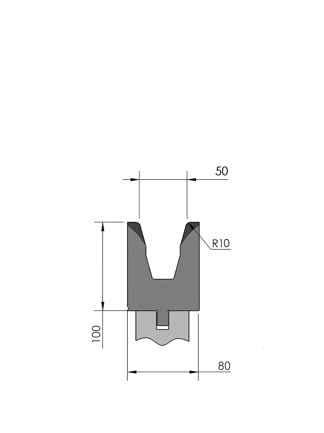 New Standard Premium bottom tool provided with WILA New Standard ATC, Working height=100mm, V-opening=50mm/30°, Bending radius=10mm CNC-Deephardened® (at least 4mm / 56-60HRc), Material=CR-MO
