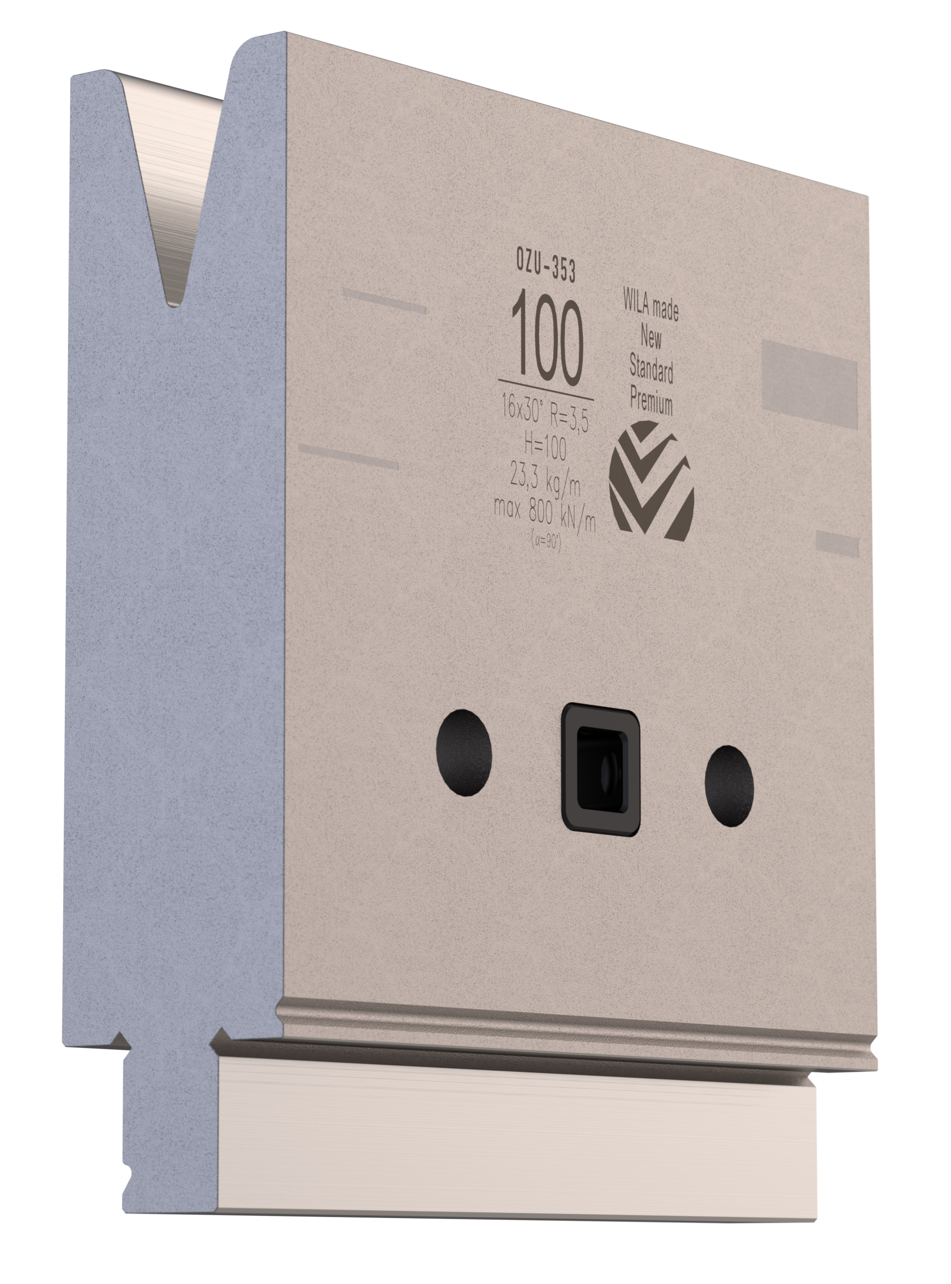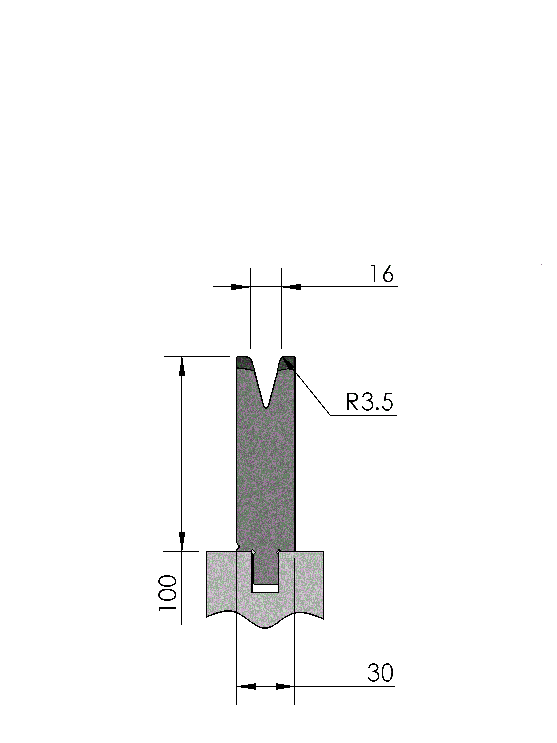 New Standard Premium bottom tool provided with ATC-adapter. Working height=100mm, V-opening=16mm/30°, Bending radius=3.5mm CNC-Deephardened® (at least 4mm / 56-60HRc), Material=CR-MO