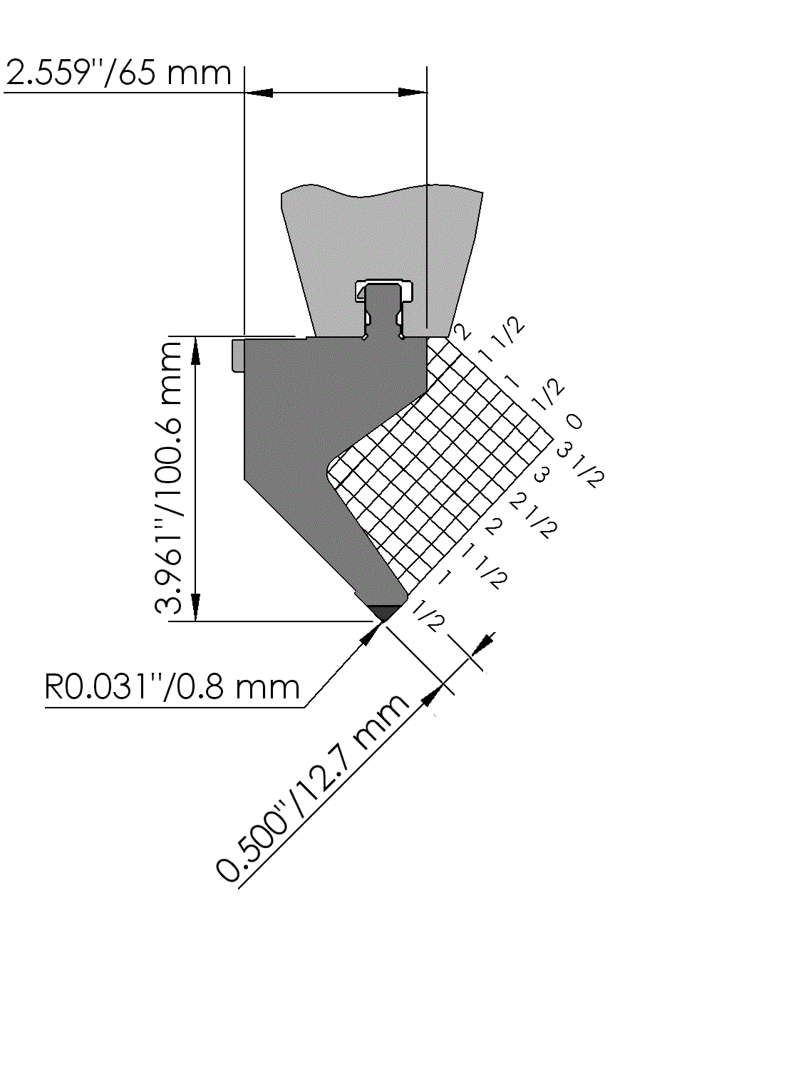 American Style top tool with Working height H=100.6mm, α=90°, Radius=0.8mm, precision ground and CNC-Deephardened® (at least 4mm / 52-60HRc), Material=CR-MO, Max. load=100ton/m. Parts <12.5kg provided with Safety-Clicks™, which allows you to change the tooling vertically; all other parts provided with fixed safety pins, which only allows you to change the tooling horizontally.