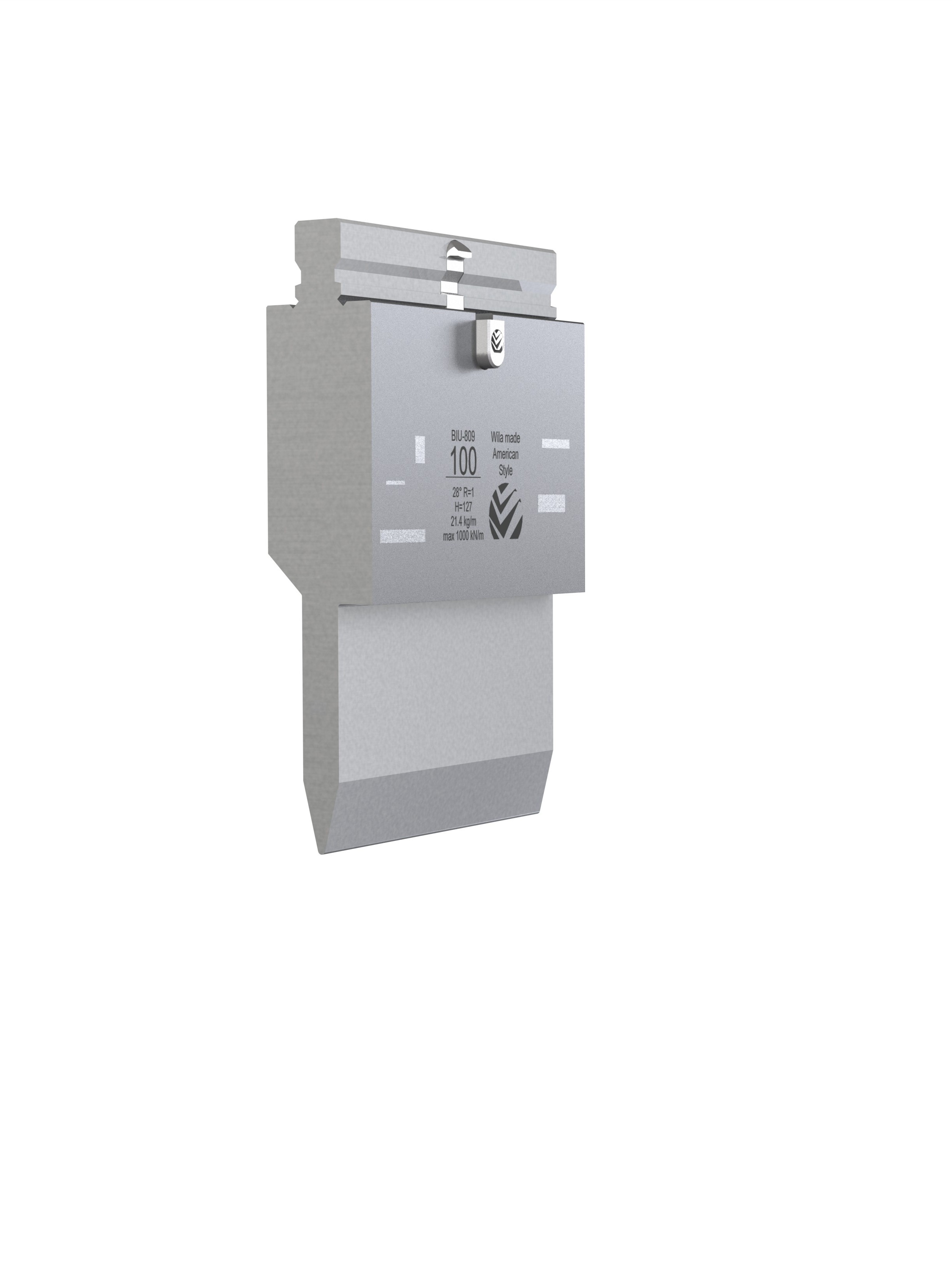 American Style top tool with Working height H=127mm, α=28°, Radius=1mm, precision ground and CNC-Deephardened® (at least 4mm / 52-60HRc), Material=CR-MO, Max. load=100ton/m. Provided with Safety-Clicks™, which allows you to change the tooling vertically.