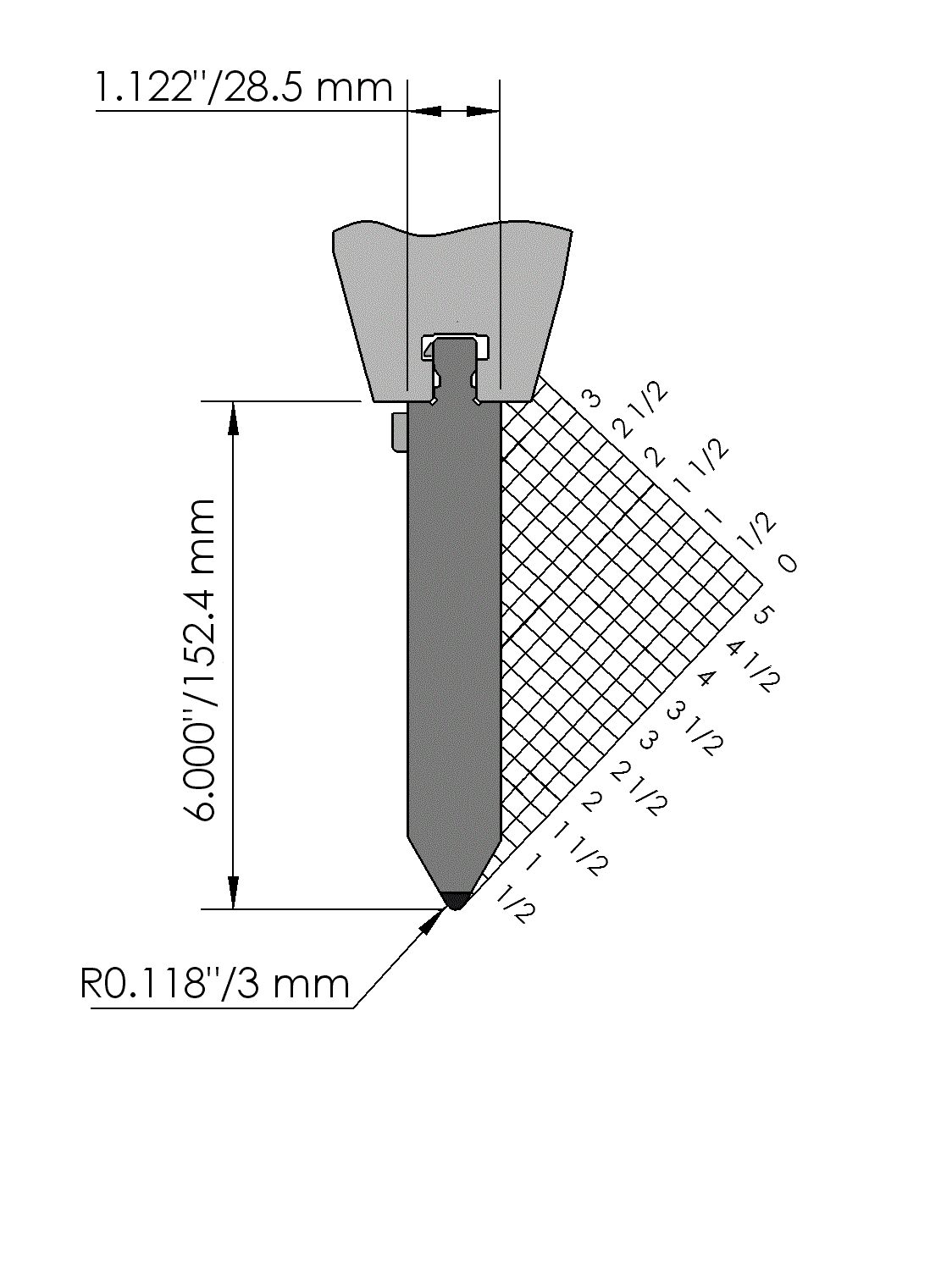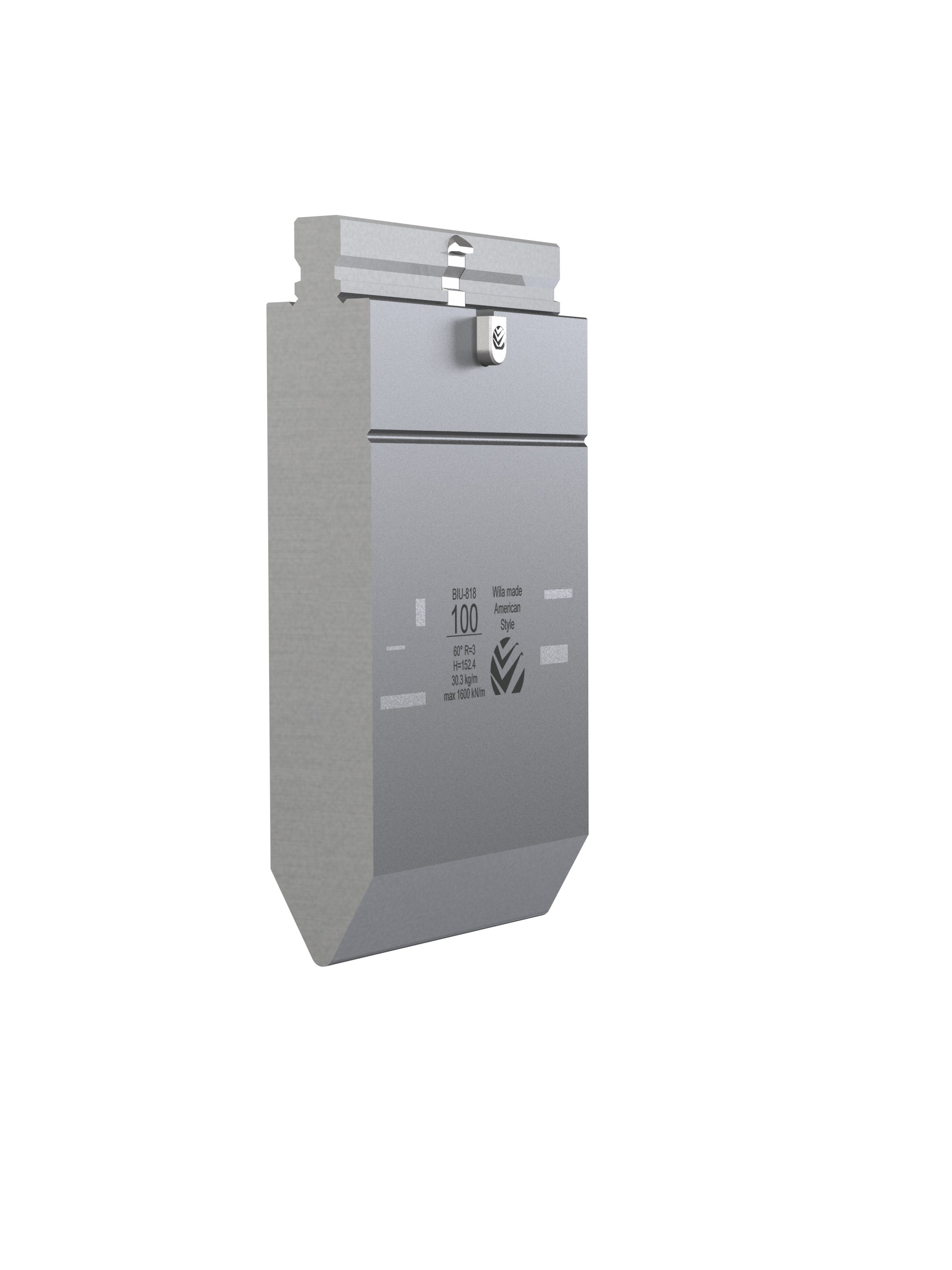 American Style top tool with Working height H=152.4mm, α=60°, Radius=3.2mm, precision ground and CNC-Deephardened® (at least 4mm / 52-60HRc), Material=CR-MO, Max. load=160ton/m. Parts <12.5kg provided with Safety-Clicks™, which allows you to change the tooling vertically; all other parts provided with fixed safety pins, which only allows you to change the tooling horizontally.