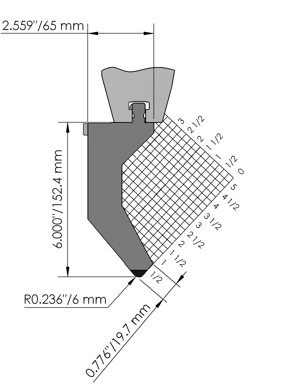 American Style top tool with Working height H=152.4mm, α=80°, Radius=6mm, precision ground and CNC-Deephardened® (at least 4mm / 52-60HRc), Material=CR-MO, Max. load=130ton/m. Parts <12.5kg provided with Safety-Clicks™, which allows you to change the tooling vertically; all other parts provided with fixed safety pins, which only allows you to change the tooling horizontally.