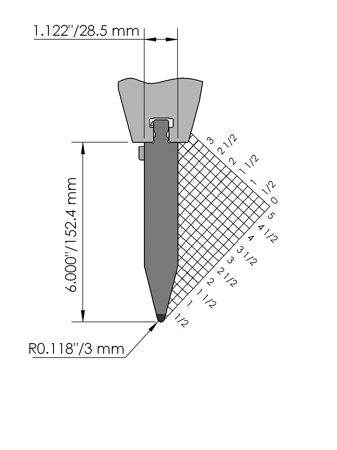 American Style top tool with Working height H=152.4mm, α=28°, Radius=3mm, precision ground and CNC-Deephardened® (at least 4mm / 52-60HRc), Material=CR-MO, Max. load=160ton/m. Parts <12.5kg provided with Safety-Clicks™, which allows you to change the tooling vertically; all other parts provided with fixed safety pins, which only allows you to change the tooling horizontally.