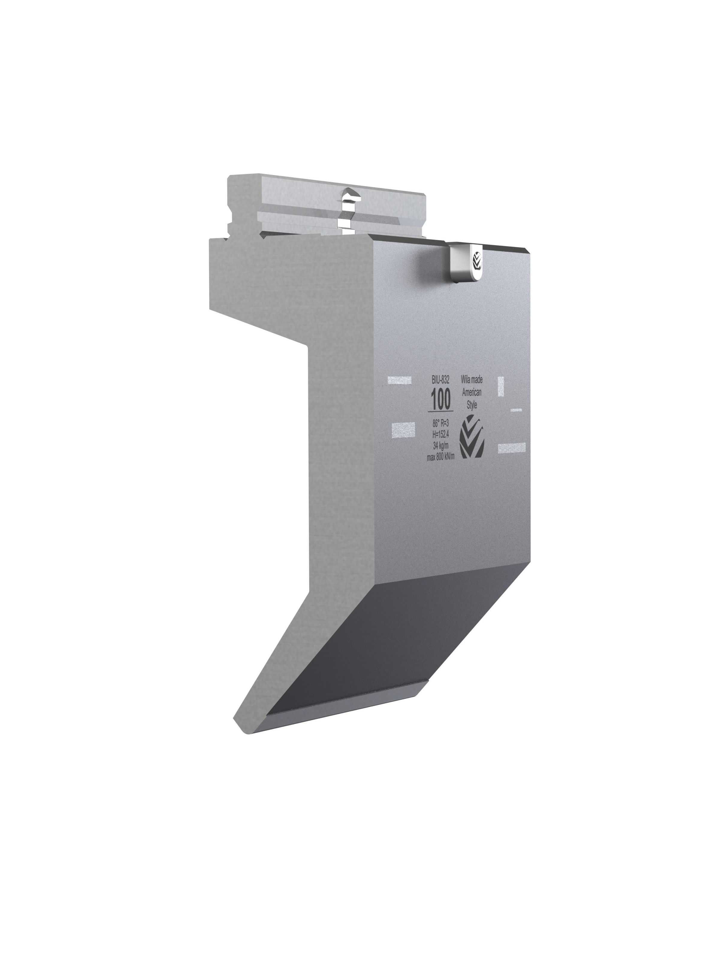 American Style top tool with Working height H=152.4mm, α=80°, Radius=3mm, precision ground and CNC-Deephardened® (at least 4mm / 52-60HRc), Material=CR-MO, Max. load=90ton/m. Parts <12.5kg provided with Safety-Clicks™, which allows you to change the tooling vertically; all other parts provided with fixed safety pins, which only allows you to change the tooling horizontally.