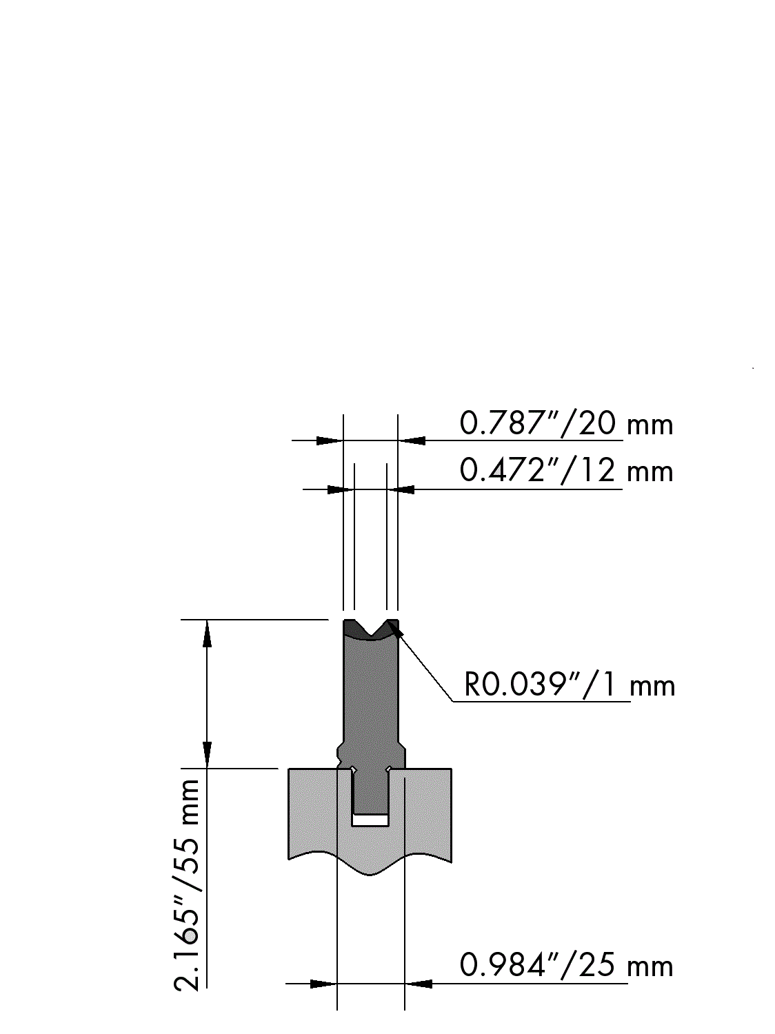 American Style bottom tool Working height=55mm, V-opening=12mm/90°, Bending radius=1mm, precision ground and CNC-Deephardened® (at least 4mm / 52-60HRc), Material=CR-MO.