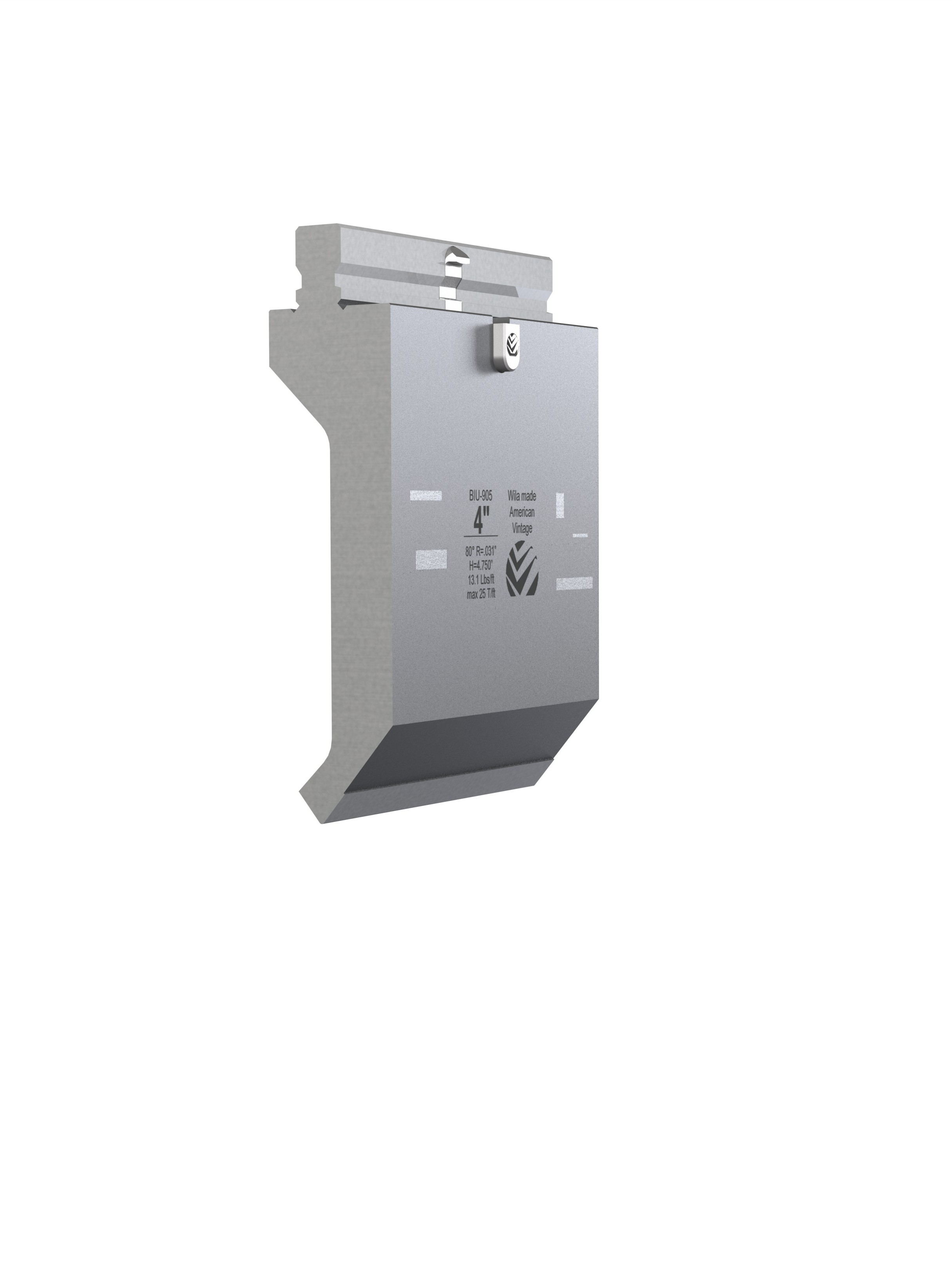 American Vintage top tool with Working height H=4.750", α=80°, Radius=.031", precision ground and CNC-hardened (approx. 0.079" / at least 52HRc), Material=C45, Max. load=25 Tons/ft. Provided with Safety-Clicks™, which allows you to change the tooling vertically.