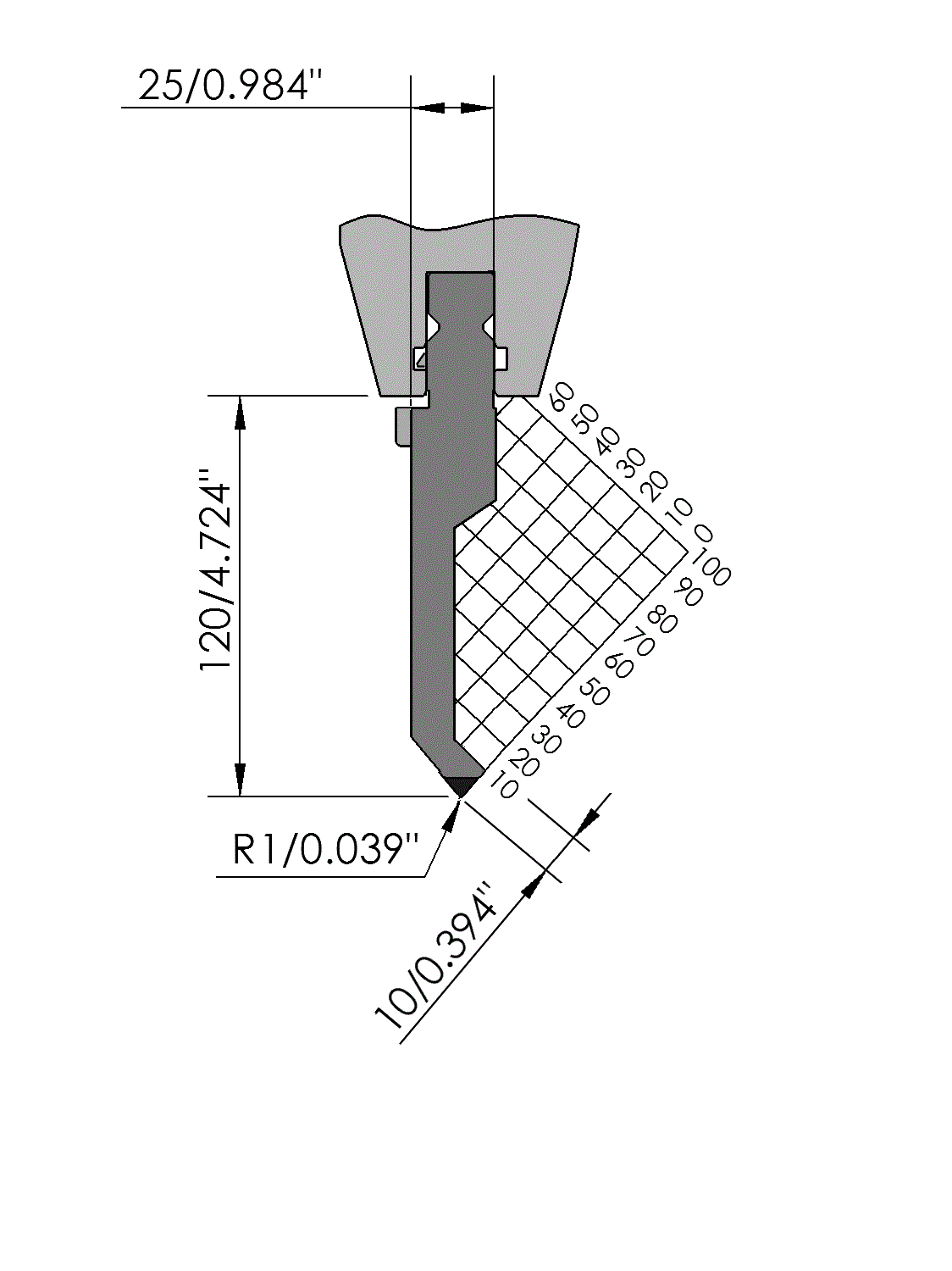 New Standard Premium top tool with Working height H=120mm, α=80°, Radius=1mm, precision ground and CNC-Deephardened® (at least 4mm / 56-60HRc), Material=CR-MO, Max. load=100ton/m. Provided with Safety-Clicks™, which allows you to change the tooling vertically.
