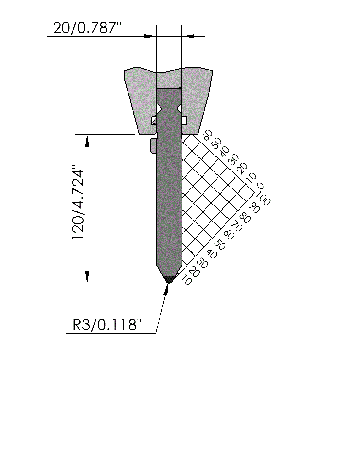 New Standard Premium top tool with Working height H=120mm, α=60°, Radius=3mm, precision ground and CNC-Deephardened® (at least 4mm / 56-60HRc), Material=CR-MO, Max. load=160ton/m. Provided with Safety-Clicks™, which allows you to change the tooling vertically.