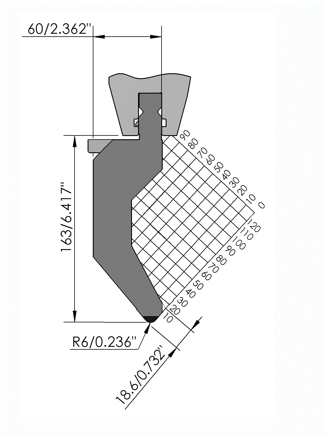 New Standard Premium top tool with Working height H=163mm, α=80°, Radius=6mm, precision ground and CNC-Deephardened® (at least 4mm / 56-60HRc), Material=CR-MO, Max. load=130ton/m. Parts <12.5kg provided with Safety-Clicks™, which allows you to change the tooling vertically; all other parts provided with fixed safety keys, which only allows you to change the tooling horizontally.