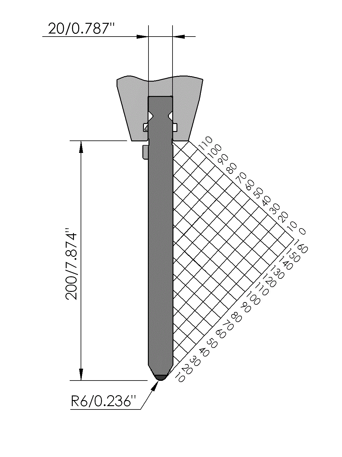 New Standard Premium top tool with Working height H=200mm, α=60°, Radius=6mm, precision ground and CNC-Deephardened® (at least 4mm / 56-60HRc), Material=CR-MO, Max. load=160ton/m. Parts <12.5kg provided with Safety-Clicks™, which allows you to change the tooling vertically; all other parts provided with fixed safety pins, which only allows you to change the tooling horizontally.