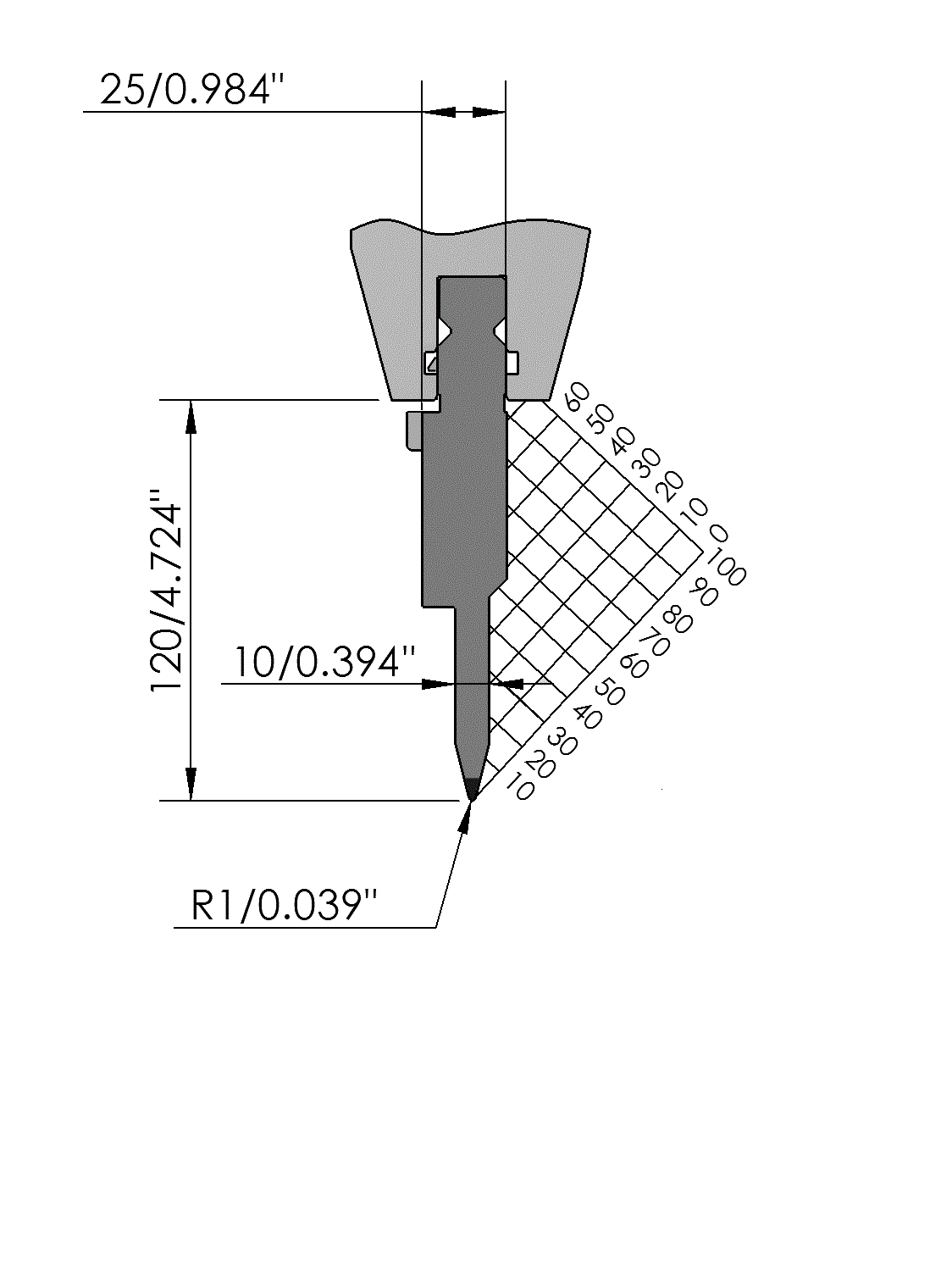 New Standard Premium top tool with Working height H=120mm, α=28°, Radius=1mm including flattening surface, precision ground and CNC-Deephardened® (at least 4mm / 56-60HRc), Material=CR-MO, Max. load=50ton/m. Provided with Safety-Clicks™, which allows you to change the tooling vertically.