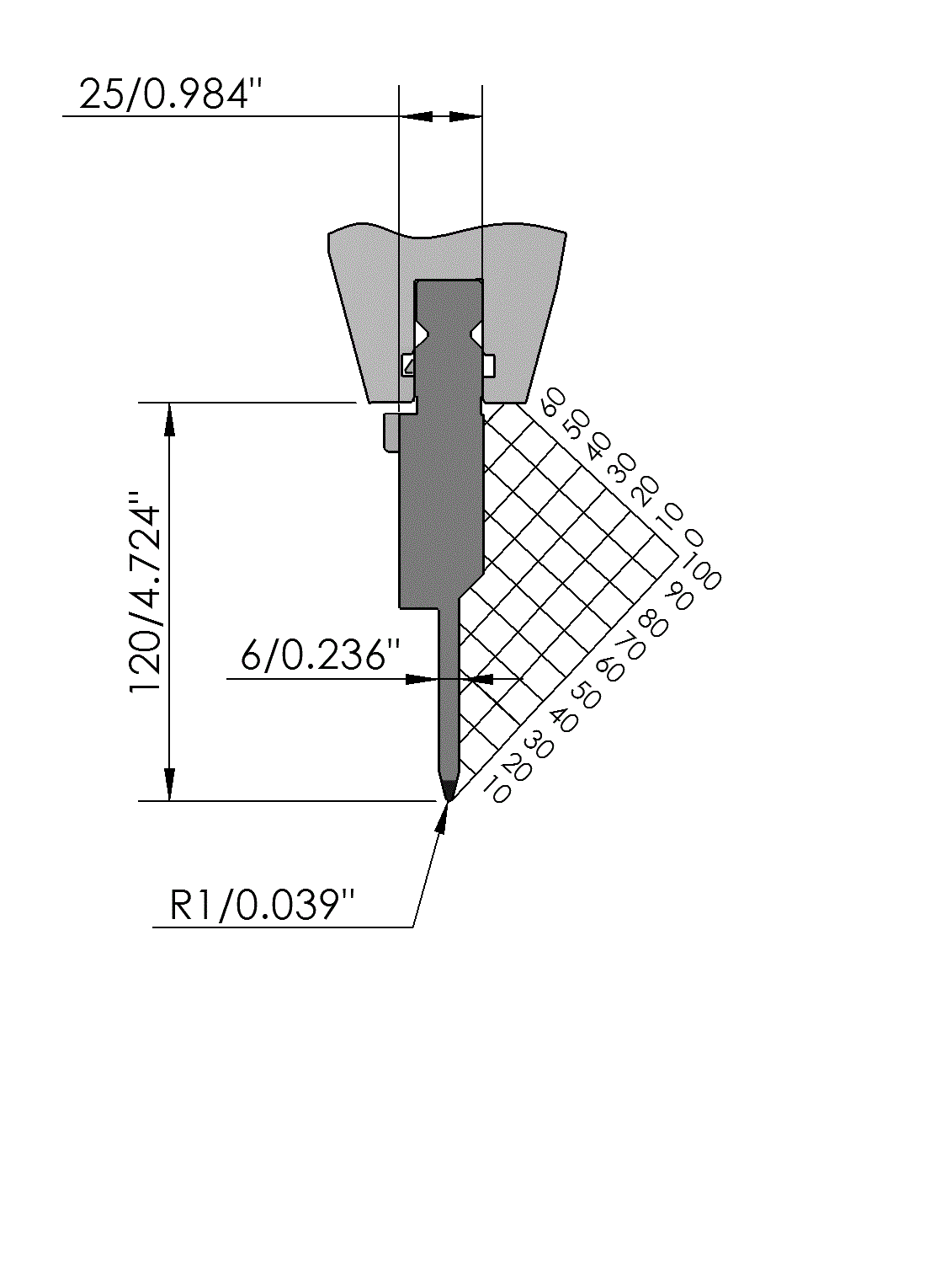 New Standard Premium top tool with Working height H=120mm, α=28°, Radius=1mm including flattening surface, precision ground and CNC-Deephardened® (at least 4mm / 56-60HRc), Material=CR-MO, Max. load=50ton/m. Provided with Safety-Clicks™, which allows you to change the tooling vertically.