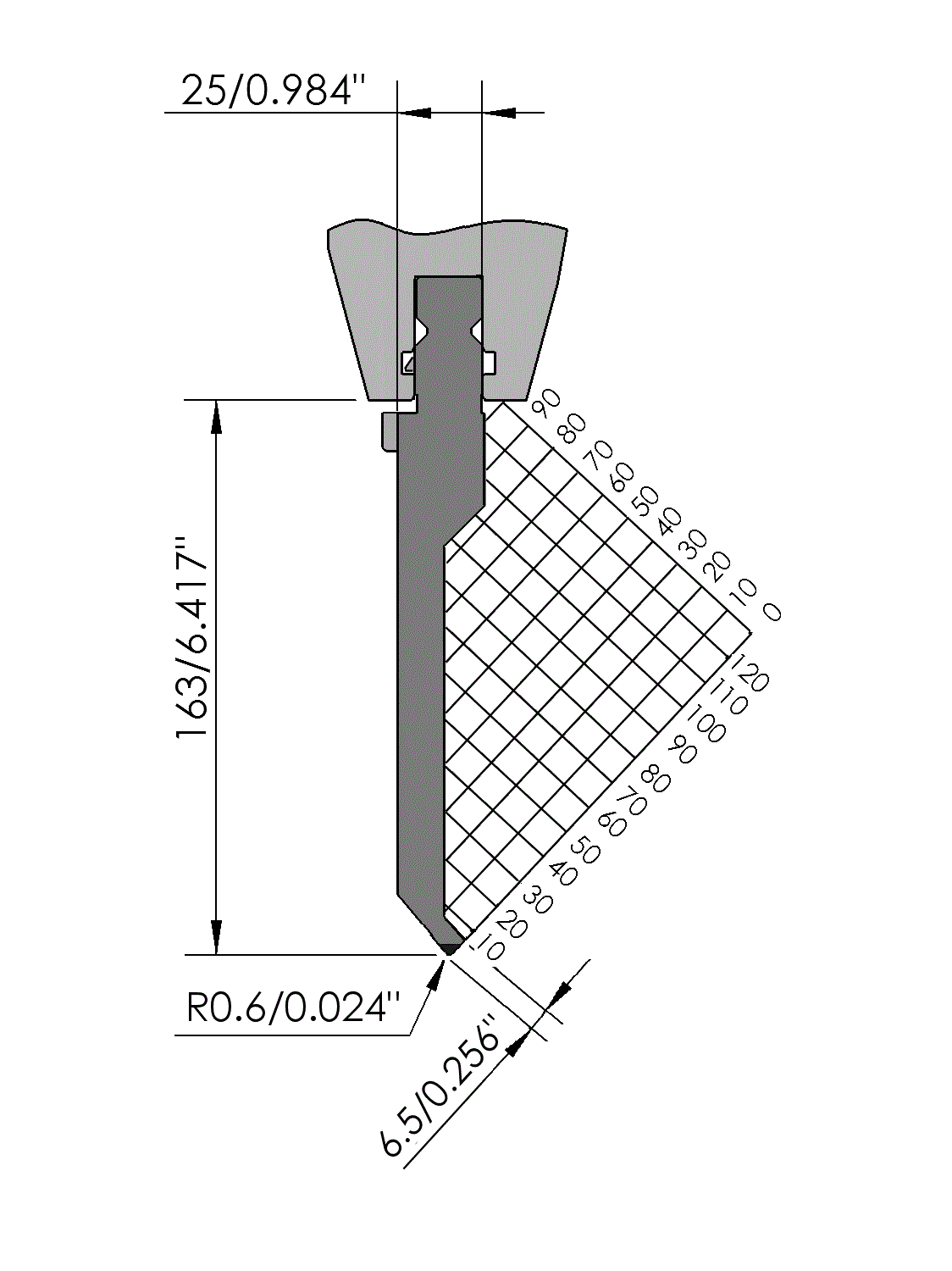 New Standard Premium top tool with Working height H=163mm, α=86°, Radius=0.6mm, precision ground and CNC-Deephardened® (at least 4mm / 56-60HRc), Material=CR-MO, Max. load=45ton/m. Provided with Safety-Clicks™, which allows you to change the tooling vertically.