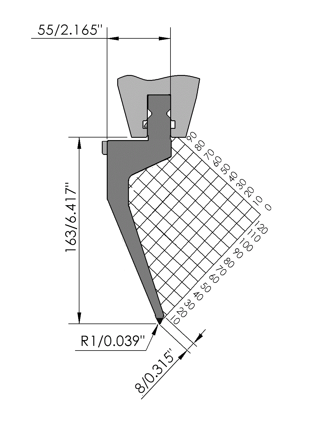 New Standard Premium top tool with Working height H=163mm, α=45°, Radius=1mm, precision ground and CNC-Deephardened® (at least 4mm / 56-60HRc), Material=CR-MO, Max. load=40ton/m. Parts <12.5kg provided with Safety-Clicks™, which allows you to change the tooling vertically; all other parts provided with fixed safety pins, which only allows you to change the tooling horizontally.